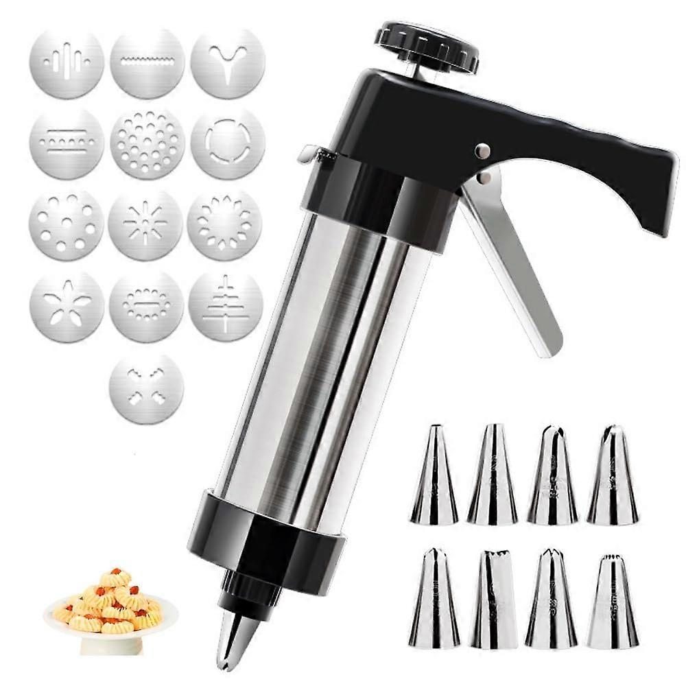 Quality materials and complete kit: Upgraded cookie press made of foodgrade stainless steel. Includes a tube, 13 cookie press plates, and 8 icing tips. Create dozens of decorative, homemade cookies quickly and easily. Rustresistant and durable for repeated use. Comfortable to hold and operate: The Christmas cookie press gun set is designed for comfort and easy use. The press gun is comfortable to hold and squeeze, and the automatic rebound design reduces effort, letting you bake with less strain during festive sessions. Easy to use: Simple installation and operation. Fill the tube with dough, select the disc or nozzle you want, place it into the cookie press, insert the disc or nozzle into the nut and tighten, then press the handle. Remember to squeeze gently after filling to release the air inside for smoother output. Easy to clean and maintain: Every part of the cookie press for baking is detachable and easy to disassemble. Clean the cookie gun with water and a little detergent, then wipe it dry. Practical applications and use scenarios: Ideal for holiday baking and Christmas cookie platters, enabling quick decoration for parties and family gatherings. Suitable for making decorative cookies for bake sales, gifts, or special occasions, with a variety of disc and tip options to suit different designs.