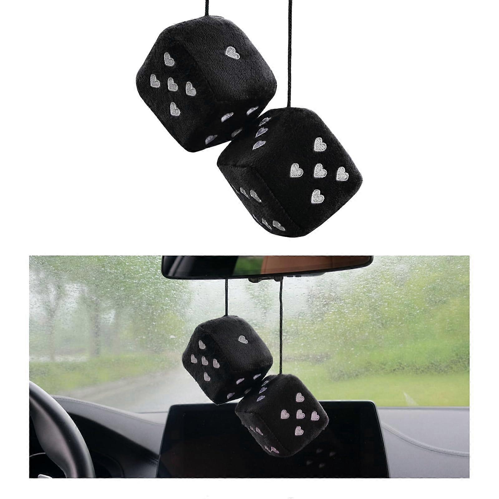 Black Fuzzy Plush Dice for Car Mirror with Heart Embroidery, Retro Rearview Hanging Ornament