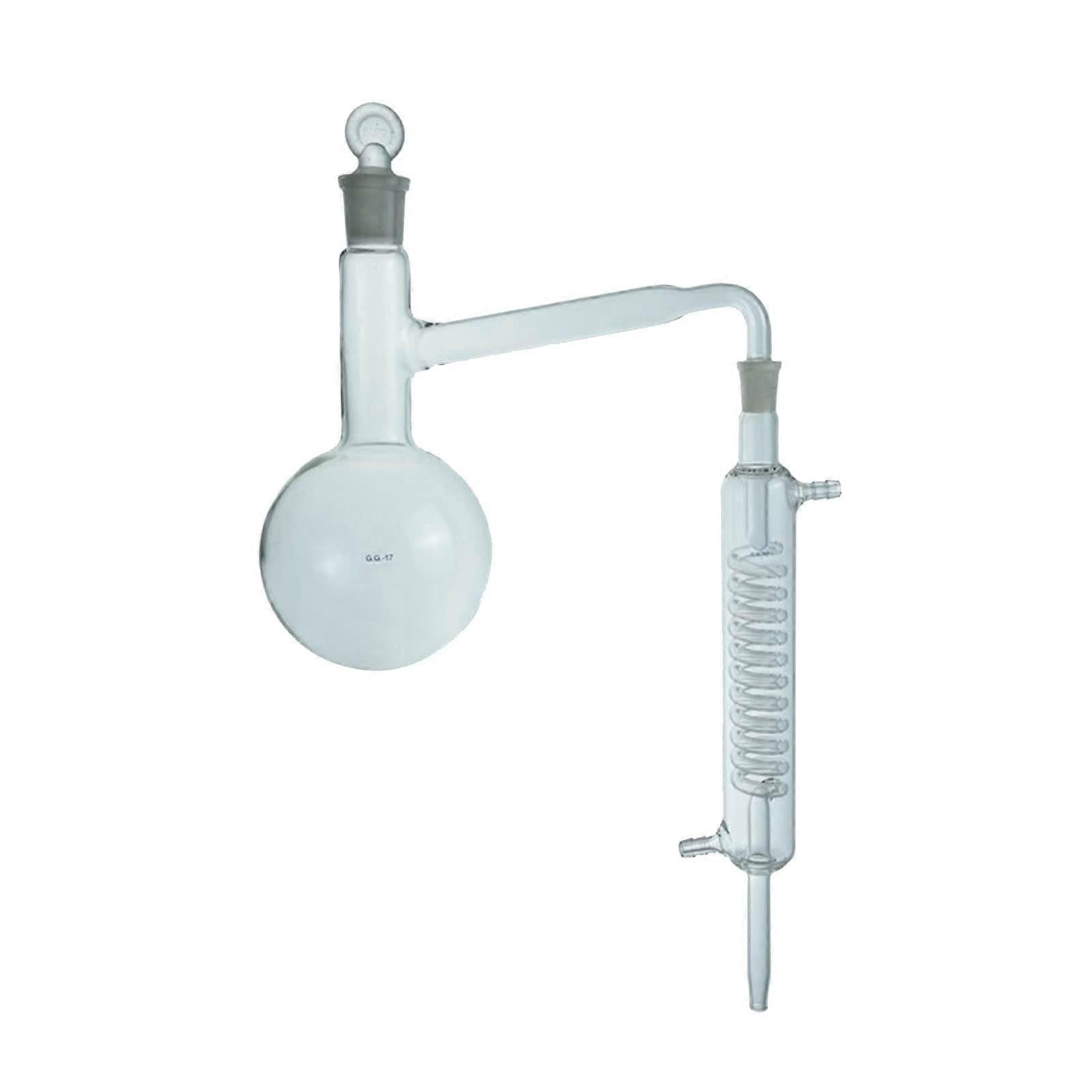 Package contains: two 500 ml distilling flasks (joint 24/29; ground mouth 14/23) and a 200 mm Graham condenser. Key benefits and features Durable heavyduty construction Glass walls offer light transmittance for easy visual monitoring. heat and temperature resistance with strong chemical resistance. Thermally stable and reusable; less prone to shattering under normal laboratory use. material quality Made from Borosilicate 3.3 glass for low thermal expansion (about onethird that of ordinary glass). Withstands temperatures and rapid temperature changes up to 200 C. Efficient condensation design Graham condenser features an inner spiral surrounded by an outer jacket tube. Vapors flow through the full length of the spiral, maximizing contact with the coolant and improving condensate collection. Clear compatibility and practical performance 500 ml capacity per flask with standard joint size 24/29 and ground mouth 14/23. Includes a 200 mm condenser to integrate with compatible distillation setups. Suitable for routine lab distillation, purification, and related glassware applications. Use scenarios Solvent distillation and purification Ideal for purification of volatile solvents in smallscale synthesis where visual monitoring and reliable condensation are important. Essential oil and natural product processing Suitable for distilling and concentrating plant extracts where efficient condensation and chemical resistance are required. Laboratory reflux and synthesis Works well in simple reflux setups or as part of a larger glassware assembly for reaction workups requiring stable, durable components. Notes for use Ensure proper assembly with compatible joints (24/29) and ground mouth (14/23) fittings. Use appropriate support and clamps as needed to maintain stability during heating.