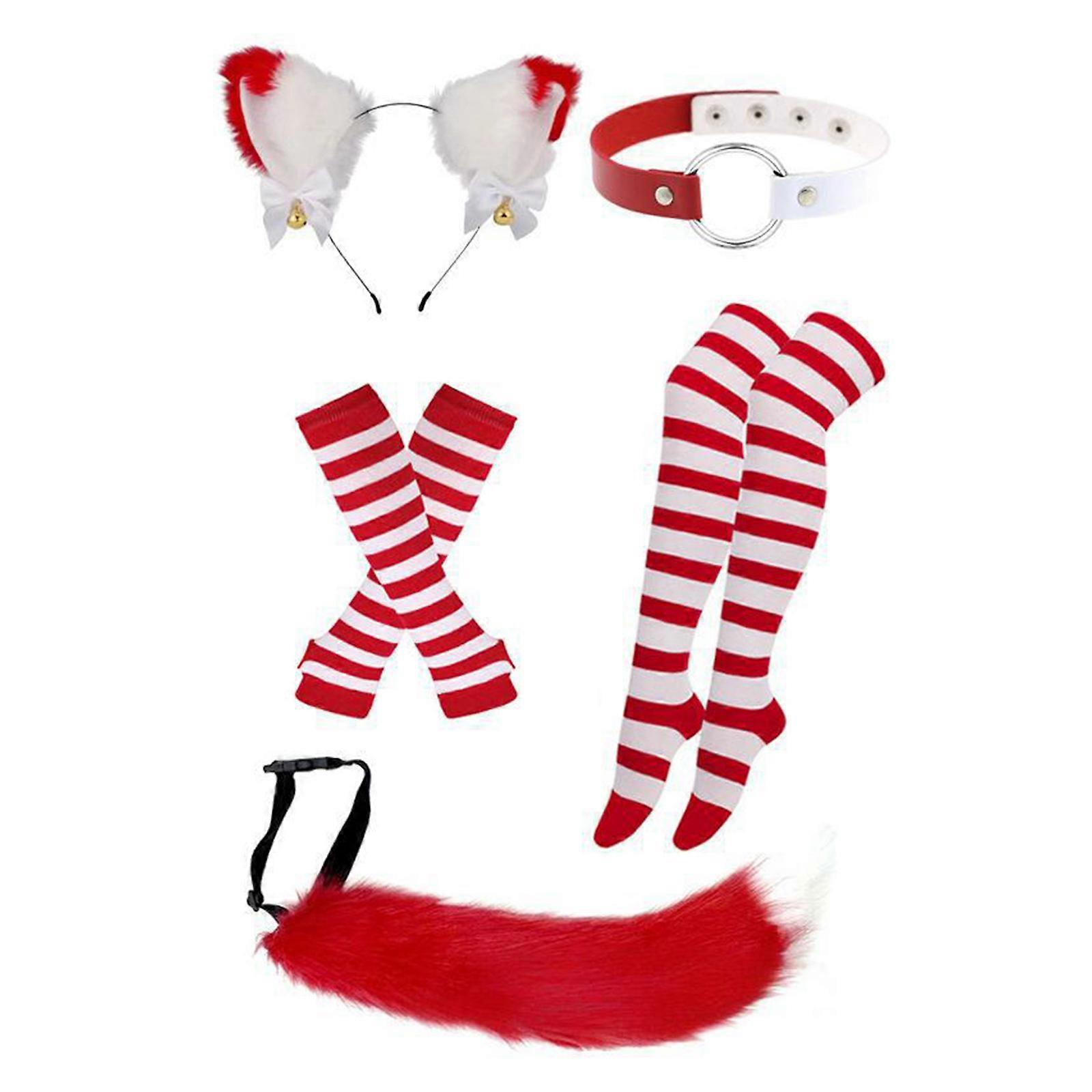 Fanciful Catling Costuming Set Molded Earband Flexible Curvilinear Tail Fleece Gloves And Close Hosiery Red