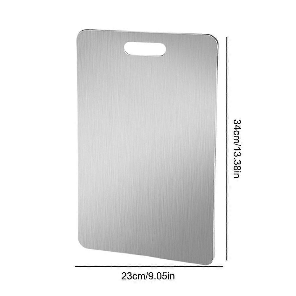 [DETAIL]<br>Stainless Steel Chopping Board Double Sided Baking Board Thickened Easy To Clean for Kitchen for Meat Fruit Vegetables Baby Food<br>Feature:<br>1. Ample Space:<br>Our stainless steel cutting board offers various sizes for you to choose, offering plenty of room to accommodate all your chopping needs. The dual-sided design allows you to use one side for fruits and vegetables and the other for meats, effectively preventing cross-contamination and ensuring a hygienic cooking environment.<br>2. Reduces Clutter:<br>Unlike wooden or bamboo boards, our stainless steel chopping board does not develop cut marks, grooves, or punctures from knife use and does not absorb liquids. This makes it a safer and more sanitary option for your kitchen, significantly reducing the mess and clutter typically associated with other cutting boards.<br>3. Highly :<br>Constructed from stainless steel, this kneading dough board is incredibly and can withstand heavy-duty chopping, slicing, and dicing. It is designed to endure the pressure of sharp knives and rigorous use, ensuring it will last for years without showing signs of wear and tear.<br>4. Efficient and Portable:<br>Cleaning this stainless steel baking board is a breeze; simply wipe it down with water and it's ready for your next use. Its lightweight design makes it easy to transport, while its sturdy construction prevents it from warping or breaking, making it a reliable companion for both home kitchens and outdoor cooking.<br>5. Easy to Clean:<br>If you're concerned about stains and odors on wooden or plastic boards, you'll appreciate the ease of cleaning our stainless steel pastry board. Food particles and liquids do not adhere to its surface, allowing for quick and effortless cleaning. Just rinse it under running water, and it dries almost instantly, ready for immediate use.<br>Specification:<br>Origin: Mainland China<br>Color: Silver<br>Size:<br>29x20cm/11.41*7.87inch<br>34x23cm/13.38*9.05inch<br>39x28cm/15.35*11.02inch<br>46x30cm/18.11*11.81inch<br>Material: Stainless Steel<br>Note:<br>Due to the different monitor and light effect, the actual color of the item might be slightly different from the color showed on the pictures. Thank you!<br>Please allow 1-2cm measuring deviation due to manual measurement.<br>1 x Cutting Board<br><br>[ATTRIBUTES]<br>- High-concerned chemical: None<br>- Material: Stainless steel<br>- Feature: Stocked,Eco-Friendly<br>- High-concerned chemical: None<br>- Material: Stainless steel<br>- Feature: Stocked,Eco-Friendly<br>- Shape: Rectangle<br>- Certification: CE / EU<br>- Brand Name: VKTECH<br>- Origin: Mainland China