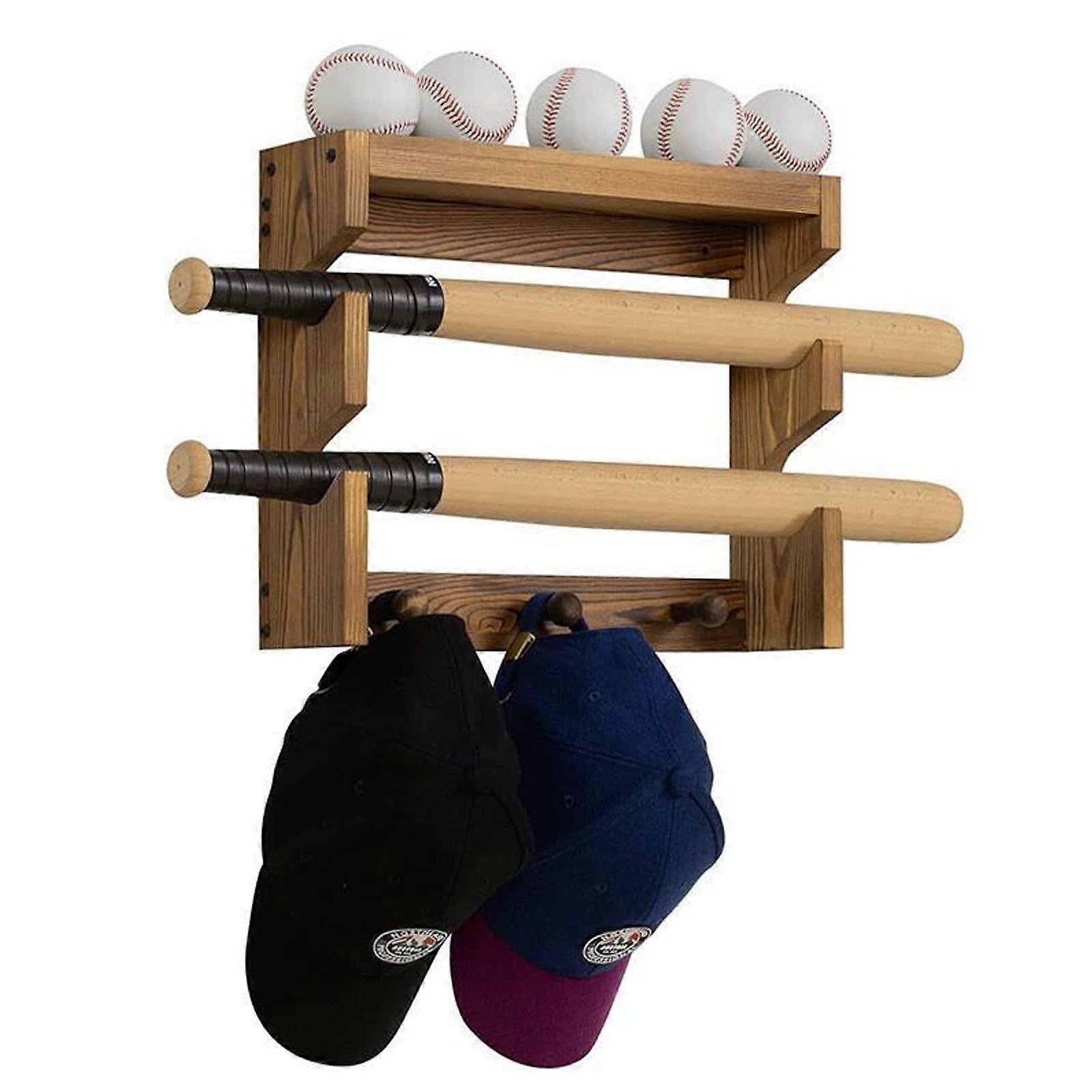 Wall Mounted Baseball Bat Rack with Ball Storage, Rustic Wood Holder and Display Shelf with Hooks