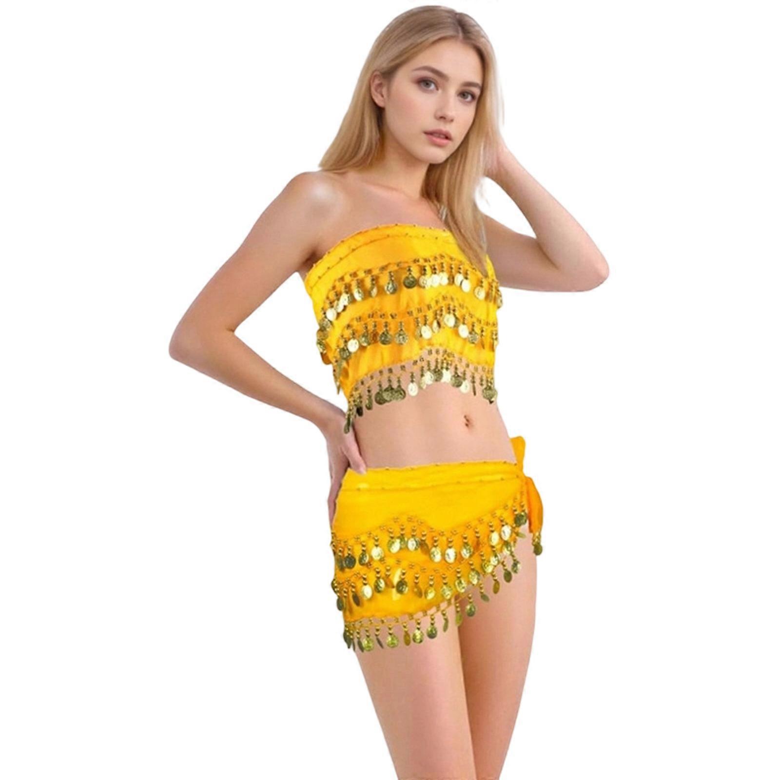 2Pcs Belly Dance Costumes Bellydance Hip Scarf and Top Set Belly Dancer Outfits Set for Womens Halloween Costumes Yellow os
