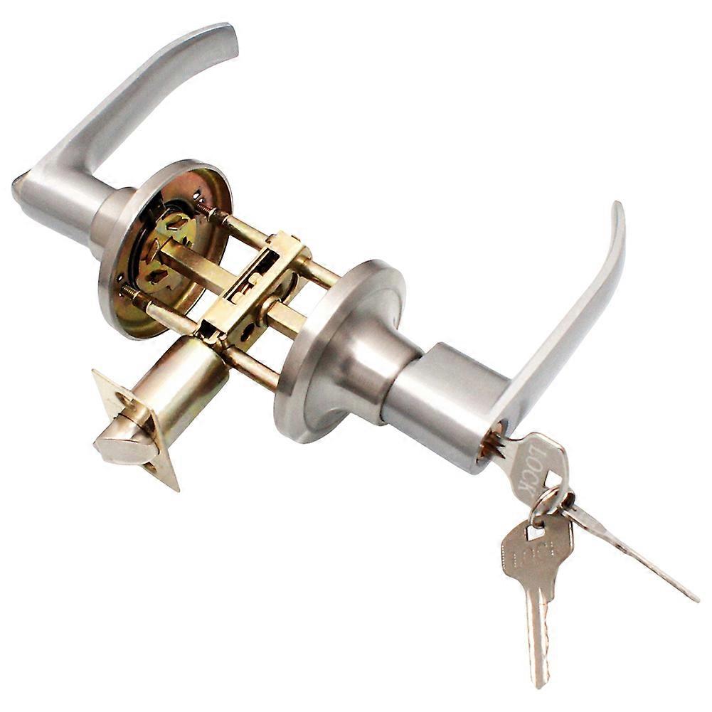 [DETAIL]<br>Door Lever Lock with 3 Keys Locking Door Handle Stainless Steel Entrance Door Handles Interior Lever Lock for Bedroom Front Door<br>Features:<br>1. Elegant Brushed Finish:<br>Crafted with a refined brushed finish, this door lever lock adds a touch of sophistication to any room. Its sleek and stylish design enhances your home decor while providing reliable functionality.<br>2. Secure Lock Core:<br>Featuring a high-security lock core, this locking door handle ensures maximum safety and durability. Its construction offers peace of mind, making it an ideal choice for bedrooms, bathrooms, and other interior doors.<br>3. Premium Stainless Steel:<br>Made from high-quality stainless steel, this entrance door handle is built to last. Its exceptional durability and resistance to wear ensure a long service life, maintaining its pristine condition even with frequent use.<br>4. Silent Operation:<br>Designed for quiet performance, this interior lever lock minimizes noise during operation. Its smooth and silent mechanism is for maintaining a peaceful environment in bedrooms and other quiet spaces.<br>5. Versatile Application:<br>Suitable for various interior doors, including bedrooms, bathrooms, and wooden doors, this door knob replacement offers versatile installation options. Its easy-to-install design makes it a convenient and reliable choice for any home.<br>Specification:<br>Origin: Mainland China<br>Material: Stainless Steel<br>Size: 170*115*75mm/6.63*4.49*2.93in<br>Weight: 278g<br>Door Thickness: 25-45mm<br>Features: Preferred Material, Strong And<br>Note:<br>Due to the different monitor and light effect, the actual color of the item might be slightly different from the color showed on the pictures. Thank you!<br>Please allow 1-2cm measuring deviation due to manual measurement.<br>1x Door Lever Lock<br>3x Key<br><br>[ATTRIBUTES]<br>- High-concerned chemical: None<br>- Keys Included: Yes<br>- Material: Stainless steel<br>- High-concerned chemical: None<br>- Keys Included: Yes<br>- Material: Stainless steel<br>- Style: Lever Locks <br>- Unlock Mode: KeY<br>- Lock Type: Mechanical Lock<br>- Origin: Mainland China<br>- Certification: None