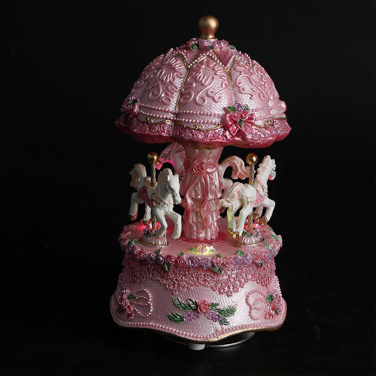 Carousel Horse Music Box with LED Light Rotating Pink Gift