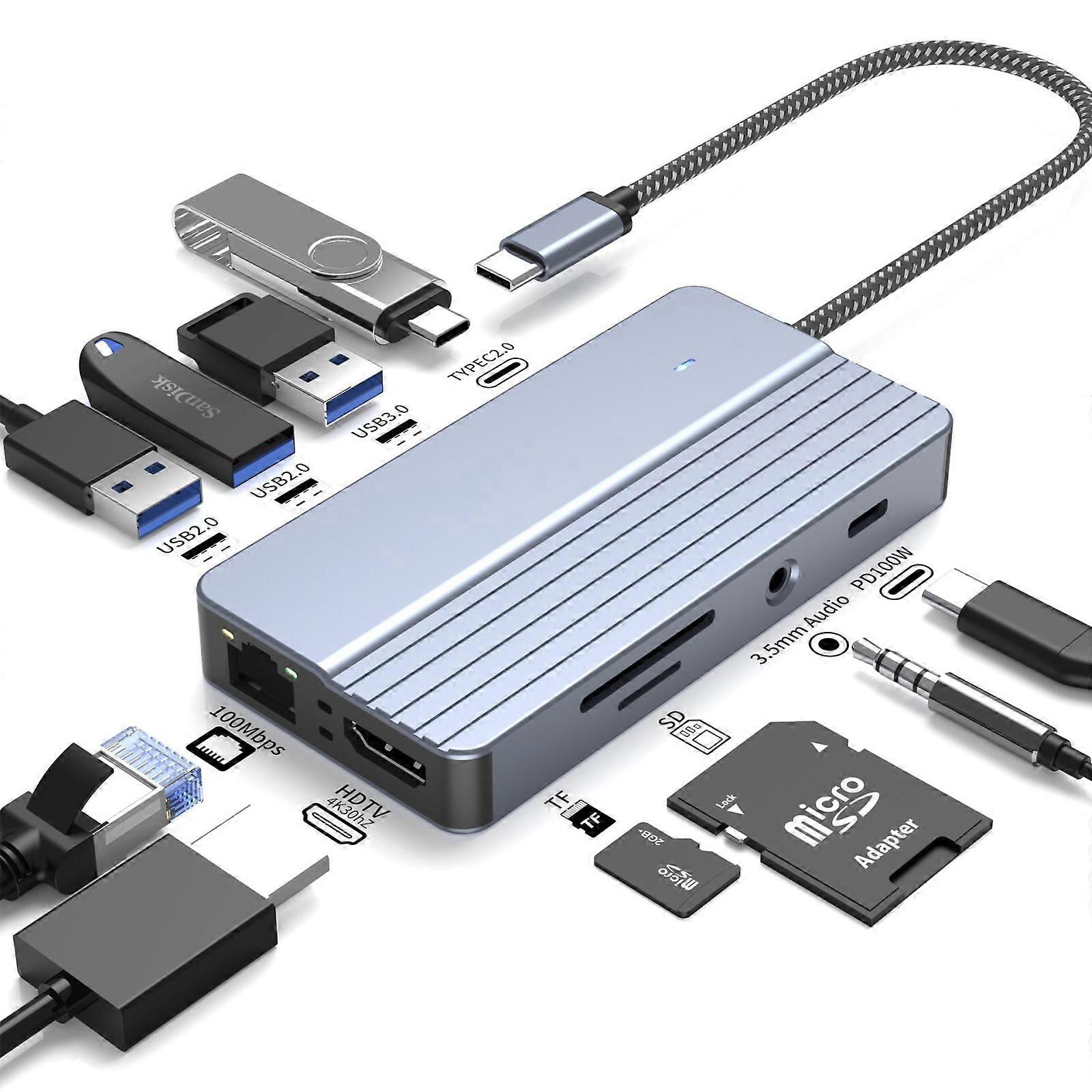10-In-1 USB-CType-C Hub With 100W Power Delivery, HDMI 4K 30Hz, USB 3.02.0 Ports, SDTF Card Reader, 100Mbps Ethernet & Audio Jack 1. 10-in-1 multifunctional Type-C docking station specifically designed for laptops and tablets, featuring a USB-C 3.1 interface and integrating 10 commonly used ports within a compact body. 2. The USB-C 3.1 interface boasts a theoretical transfer rate of 10Gbps, with backward compatibility for USB 3.0 (5Gbps) and USB 2.0 (480Mbps). Actual speeds may vary depending on device performance. 3. Power Delivery Output: Voltage: 5V-20V, Current: 3A-5A, Power: 15W-100W. 4. Cable: Cable length 18cm. 5. Expansion Ports: PD 100W + USB 3.0 + USB 2.0 x 2 + USB-C 2.0 + SDTF Card Reader + HDMI 4K 30Hz + RJ45 100Mbps Ethernet + 3.5mm Audio Jack (supports voice calls).