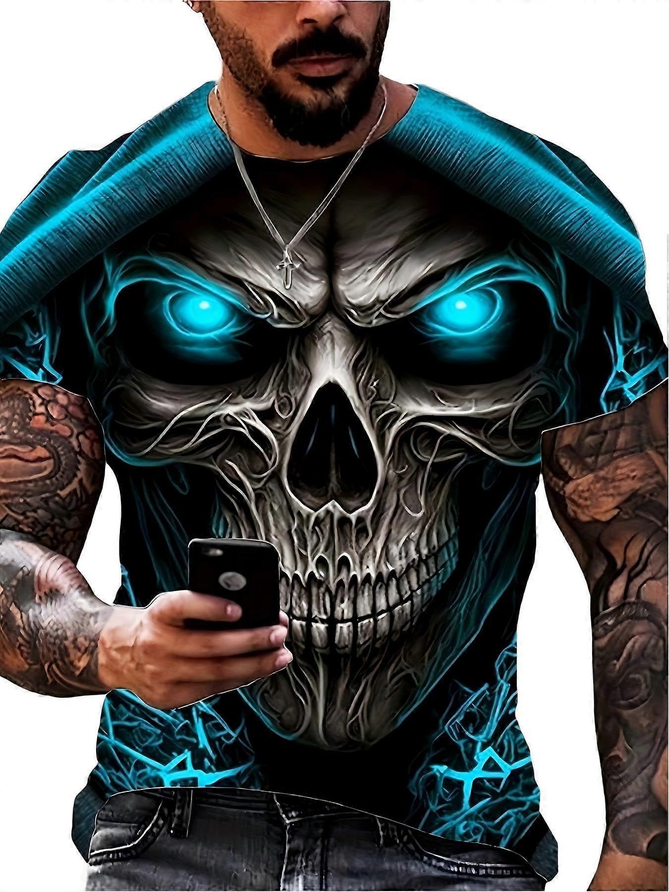 Men's 3D Print Skull With Blue Eyes Graphic T Shirt Edgy Art Print Casual Top