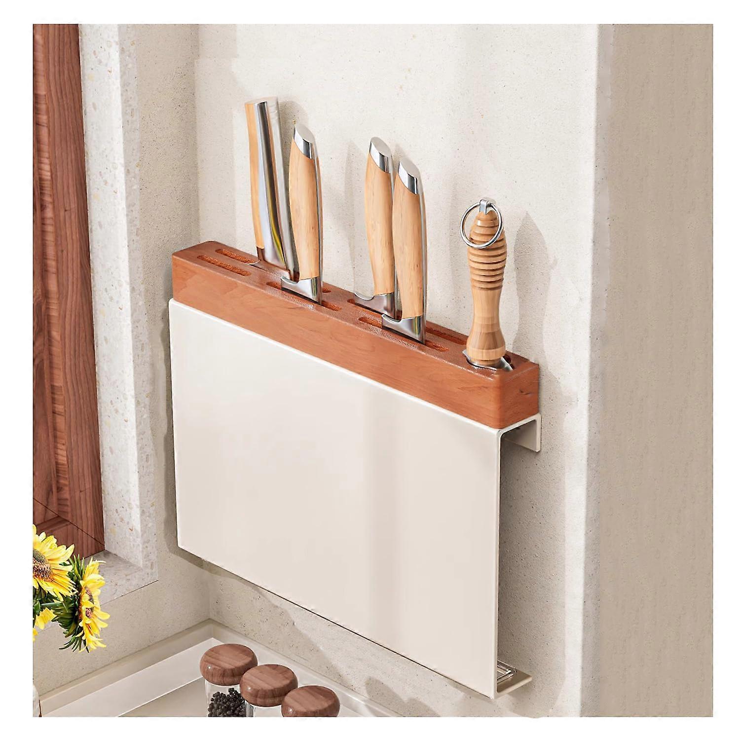 Kitchen Knife Holder Wall Mounted 6 in 1 Beech Wood Magnetic Rack with Cutting Board Storage 17.5 Inch