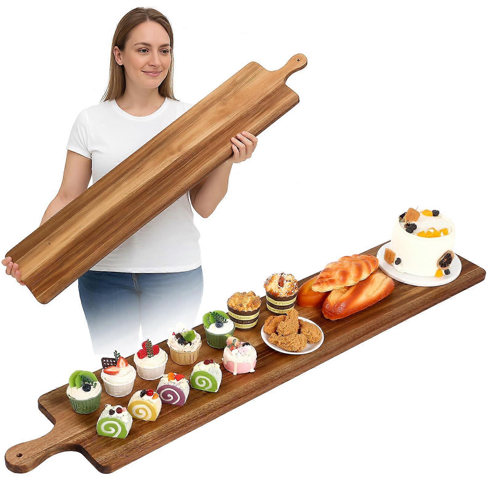 Versatile Acacia Wooden Serving Board Extra Long Design: Generously sized to beautifully showcase cheeses, cured meats, fresh vegetables, fruits, breads, or desserts, making it ideal for parties, family dinners, or holiday gatherings. Elegant Natural Finish: The rich, natural acacia wood grain complements any table decor, adding a warm and sophisticated touch to your presentation. Handcrafted Quality Solid Acacia Construction: Expertly crafted from durable, solid acacia wood with unique, natural grain patterns that make each board oneofakind. Built to Last: Sturdy design ensures dependable performance for everyday use as well as special occasions. Material Benefits Naturally Dense and Moisture Resistant: Acacia wood offers a hygienic and longlasting surface for serving a wide variety of foods. Stylish and Functional: The attractive grain and smooth finish enhance the visual appeal of appetizers and platters. Practical Features Convenient Handle: Equipped with a handle and rope hole for easy hanging and storage when not in use. Ample Serving Space: Extra long and wide surface comfortably accommodates multiple food types and arrangements, making serving more efficient. Ideal Uses 1. Hosting wine and cheese evenings, where you can lay out assorted cheeses, crackers, and fruit. 2. Serving charcuterie platters during holiday gatherings or dinner parties. 3. Presenting fresh vegetable assortments and dips at casual family barbecues. This acacia wooden serving board combines beauty, durability, and functionality, making it a versatile addition to kitchens, dining rooms, and event spaces.