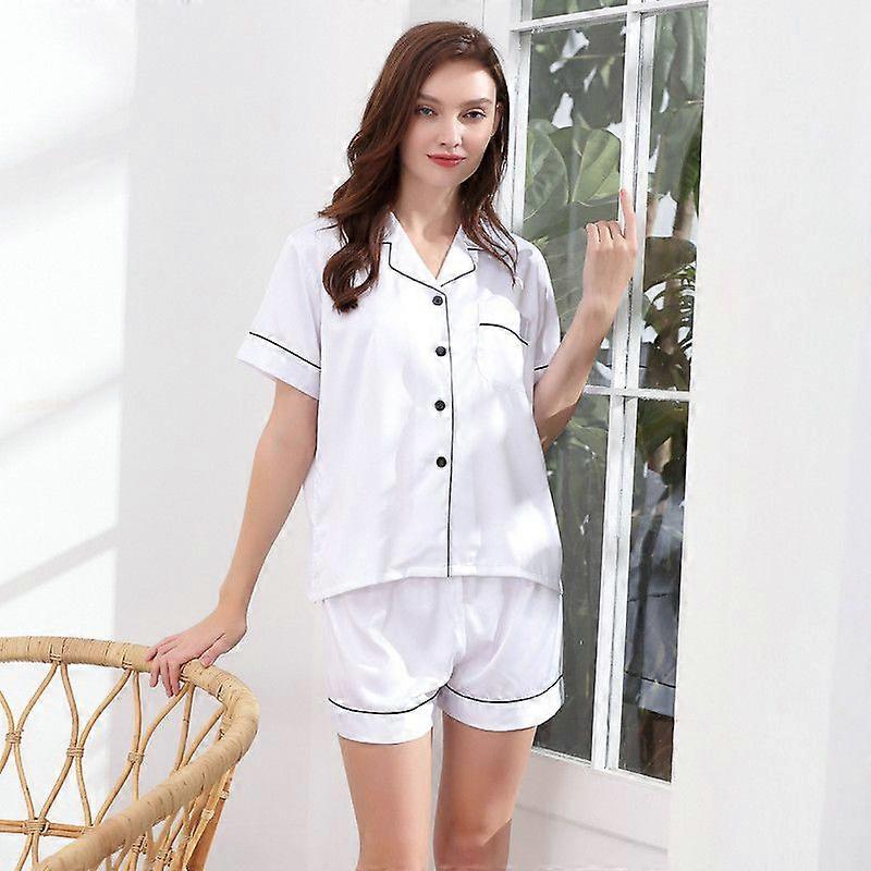 Please carefully review the size chart before placing your order! This women's satin pajama set features an elegant, soft texture to meet your needs.Product Features: Two-piece pajama set in classic nightwear style. Short-sleeve pajama top and matching bottoms. Premium ultra-soft silk satin fabric with quality stitching and perfectly lined construction. Breathable and comfortable sleepwear. Care Instructions: Hand wash separately in cold water recommended.Nightgown Top: Short-sleeve nightgown with a V-neckline, button-down front, and single chest pocket design. Lightweight and skin-friendly women's silk nightgown. Perfect for sleeping, lounging, or relaxing around the house or yard all day.Pajama Pants: Women's pajama pants with a soft elastic waistband, suitable for any body type, making relaxation as comfortable as possible. This women's summer pajama set is perfect for sleepwear, loungewear, or home attire.Better, softer, smoother, and gentler on the skin. The classic pajama set is ideal for pajama parties, bridal sets, dorm rooms, or fun family photos. This high-quality pajama set also makes an excellent gift for birthdays, Valentine's Day, Christmas, New Year's, weddings, or any occasion for mothers, wives, daughters, and friends.
