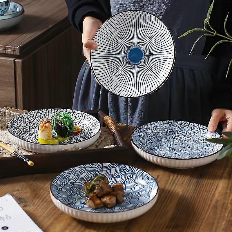 Set of 4 Japanese Ceramic Plates, Blue and White Dinner Plates with Elegant Patterns, 8 Inch, Dishwasher and Microwave Safe