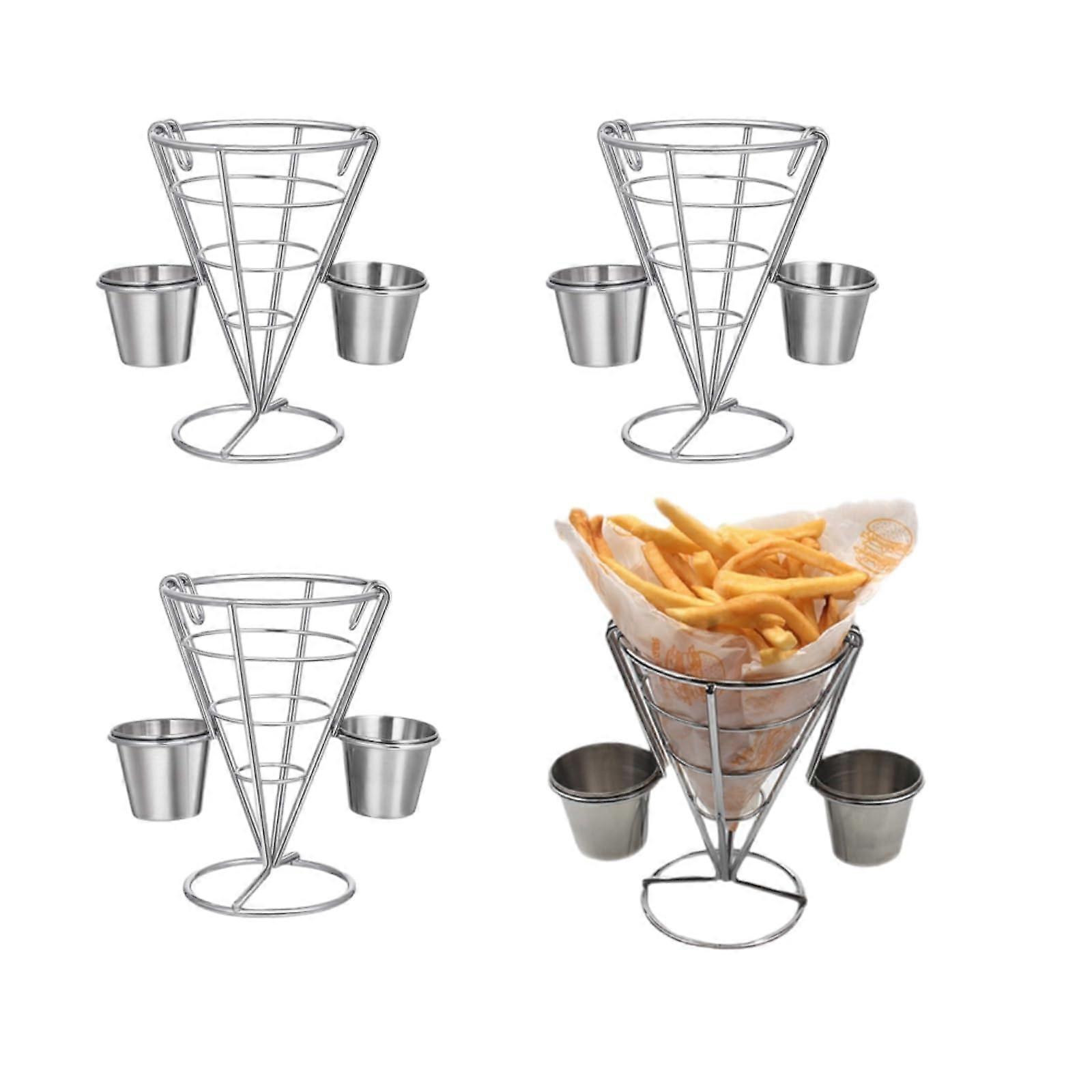 French Fry Holder 4 Pack Metal Cone Basket with Dual Sauce Cups for Appetizers and Parties