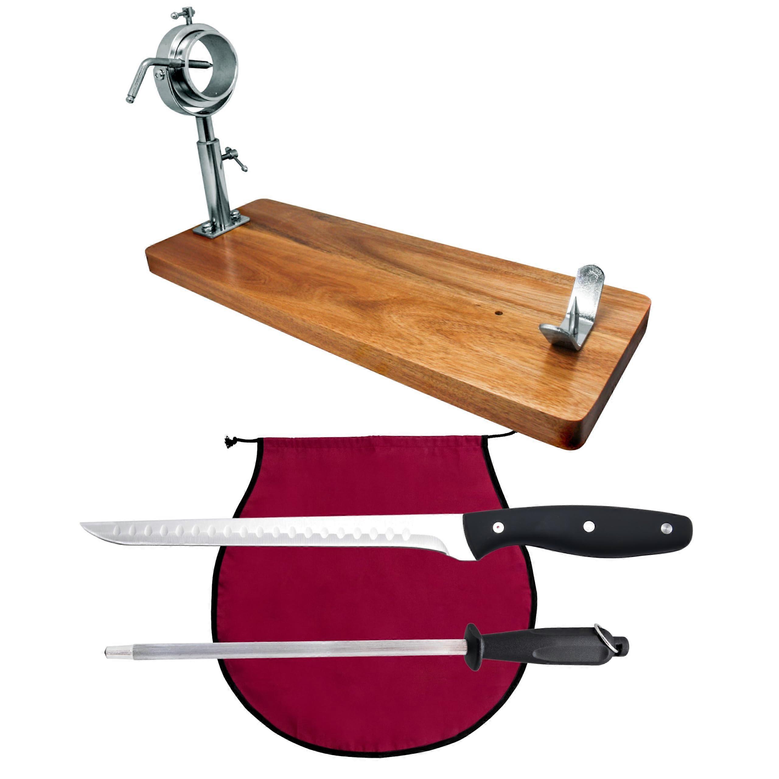 Ham Holder Set with Telescopic Swivel Head, Protective Cover, and Manual Knife Sharpener • Adjustable telescopic swivel head allows you to effortlessly change the position of the ham holder for presentation, handling, and precise cutting. Easily adapt it for both shoulder and shank cuts by repositioning the head arm bolt as needed. • Sturdy dimensions: 28 x 54 x 20 cm; weight: 2175 g. Built to provide stability while slicing, ensuring safety and ease of use. • Protective cover included to shield your ham or shoulder from mold and excess drying. Helps preserve freshness and extend product life, reducing waste and maintaining quality. • Manual knife sharpener designed for quick and efficient sharpening of your kitchen knives. Keeps blades in peak condition for smooth, effortless slicing. • Ideal for home kitchens, restaurants, and specialty food shops. for: Hosting events or family gatherings where presentation and easy serving of ham is important. Professional chefs or butchers requiring a reliable and stable ham holder for frequent use. Preserving hams during storage to maintain flavor and texture. This complete set offers precise adjustability, protective storage, and convenient knife maintenance in one package, making it a practical tool for both home cooks and professionals who value quality, efficiency, and durability.