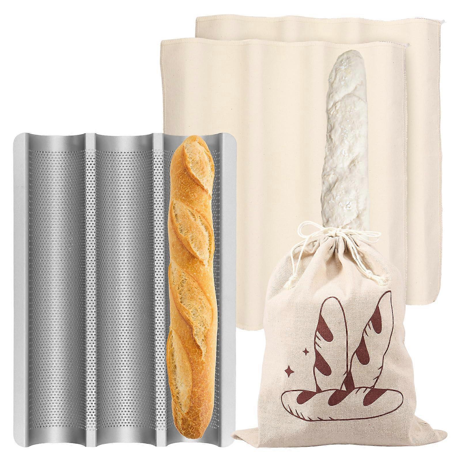 Perforated Bread Baking Pan Designed with a perforated surface to allow air circulation around the dough, ensuring an evenly baked loaf with a crisp, golden crust. Nonstick coating makes bread release effortless and cleaning simple. Before use, lightly grease the pan for the results. Ideal for baking authentic French bread and other crusty loaves. Flexible Proofing Cloth Strong and durable fabric that holds creases well and can stand upright, supporting the dough during proofing. Soft enough to shape easily, offering a balance between firmness and flexibility. Large enough to handle 3 to 4 French bread loaves at once, making it for batch baking. 3Slot French Bread Pan Dimensions: 38 x 27.5 x 3.2 cm (15 x 11 x 1 inches), compatible with most household ovens. Unique wave design supports dough structure and helps loaves maintain their shape while baking. Threeslot configuration allows you to bake up to 3 loaves simultaneously, saving time and improving efficiency. Suitable for French long bread, Italian bread, and other similar styles. Quality Construction Baking pan made from sturdy carbon steel for durability and longlasting performance. Proofing cloth crafted from , coarsegrain textured fabric, from lint. Neatly sewn edges improve durability and reduce fraying. Bread bags included are made from safe, quality fabric for storing and transporting baked goods. Practical Use Scenarios 1. Home baking enthusiasts creating authentic baguettes or Italian loaves with professional results. 2. Small bakeries producing multiple crusty loaves efficiently using the 3slot pan and proofing cloth. 3. Culinary students or chefs perfecting breadmaking techniques with durable, reliable baking tools.