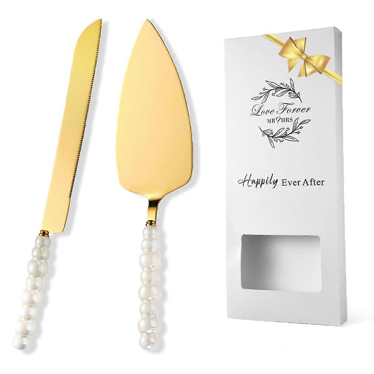Wedding Cake Knife and Server Set with Elegant Pearl Handle, Gold Stainless Steel, Bridal Gift Set of 2