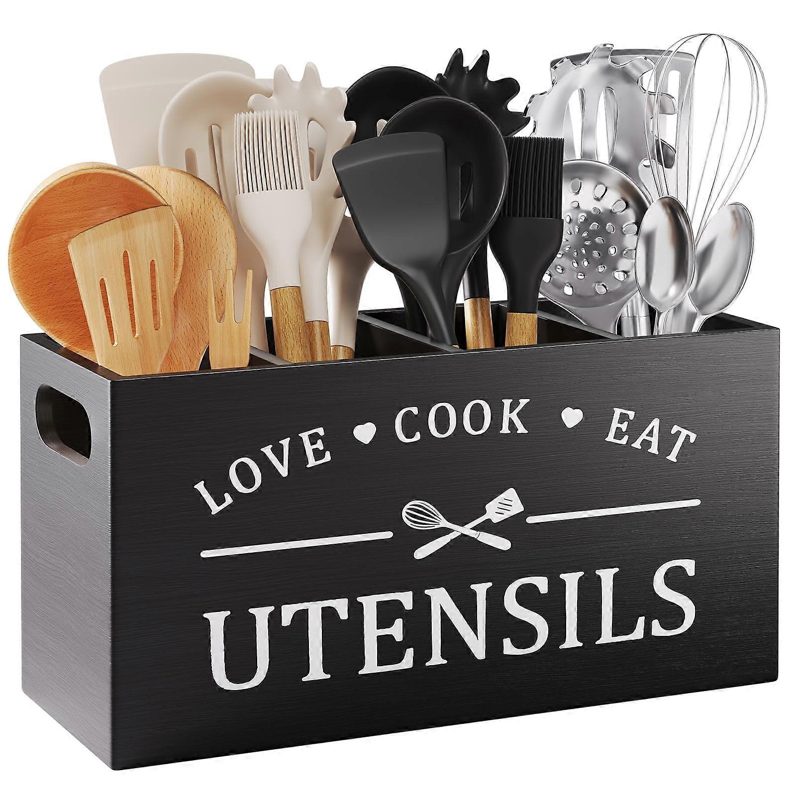 Extra Large Kitchen Utensil Holder with 4 Compartments, Black Wooden Organizer for Countertop or Wall Mount