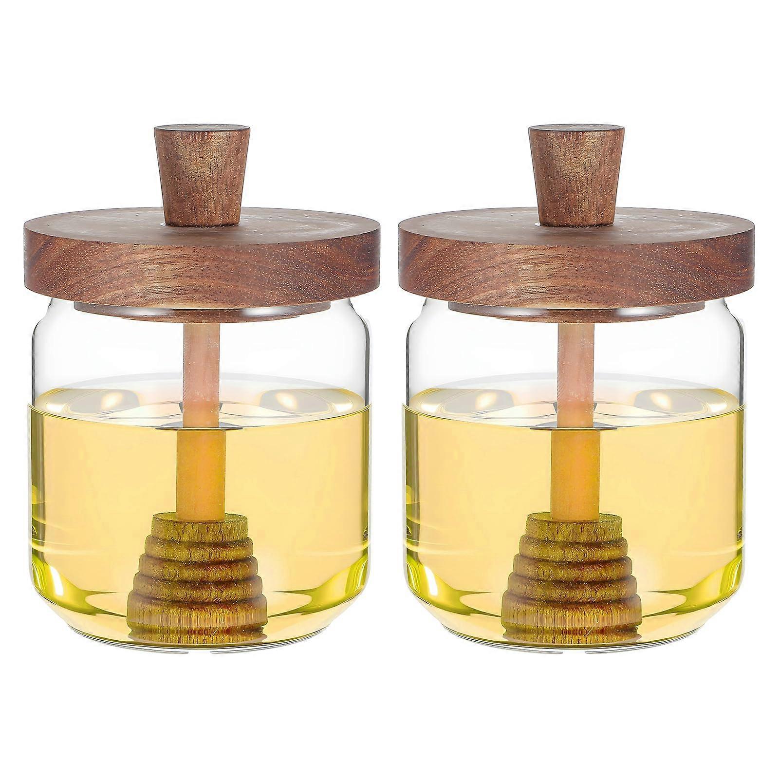 2 Pcs Glass Honey Jar with Wooden Lid and Dipper, Airtight Honey Dispenser for Kitchen Use