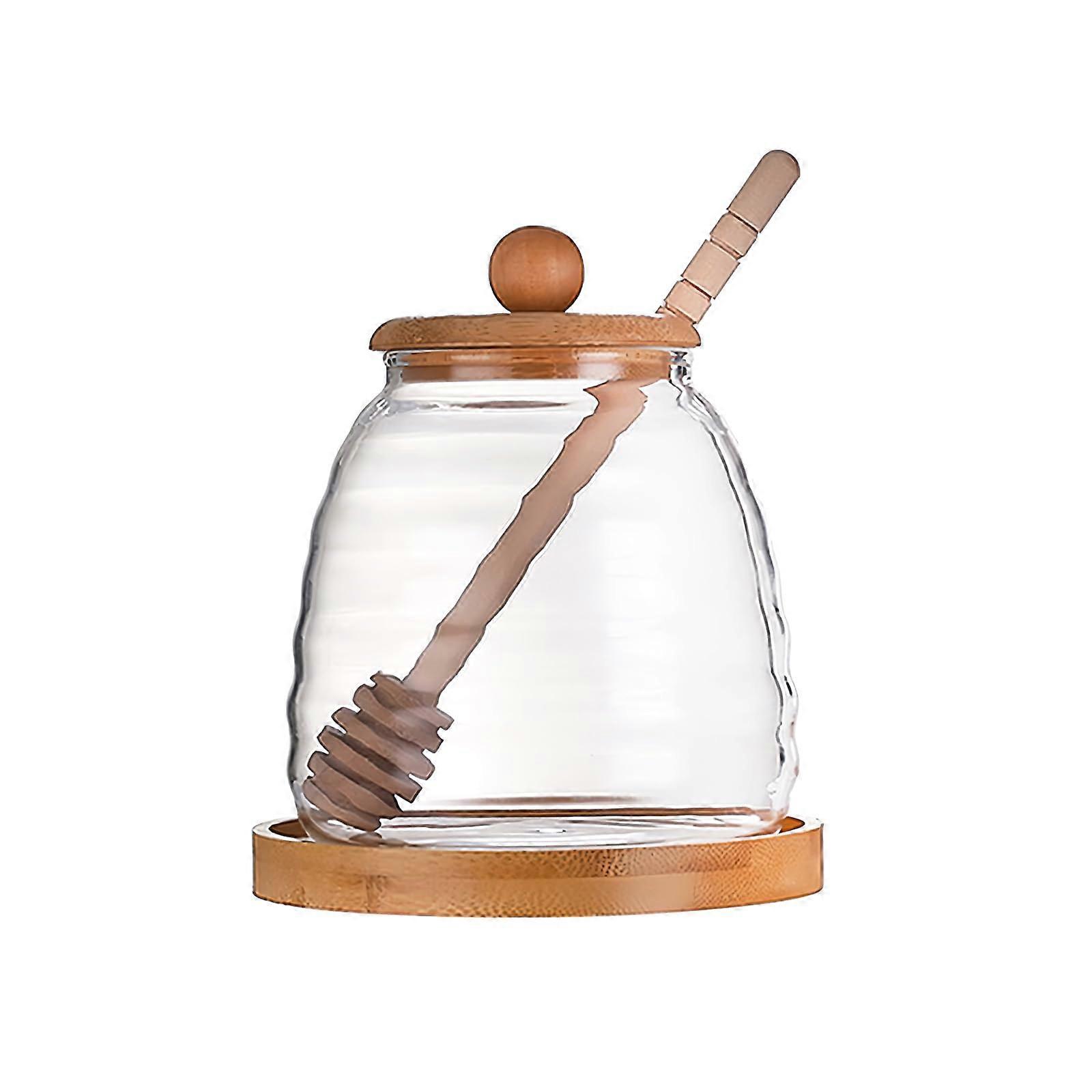 Honey Jar with Bamboo Lid and Drip Wooden Dipper, 16.9oz Borosilicate Glass Pot for Kitchen