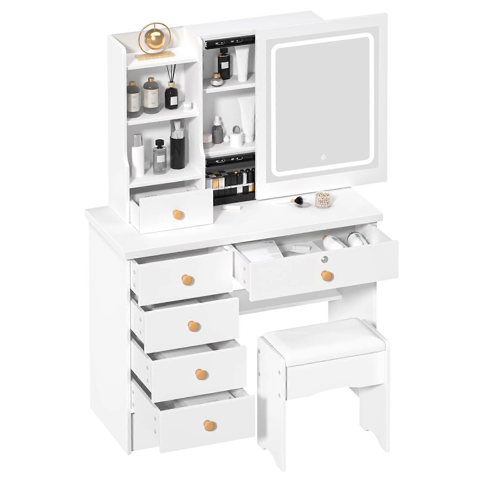 White Vanity Desk with Mirror and Touch LED Lights, Sliding Mirror, 6 Drawers, Shelves, Stool, Power Outlet