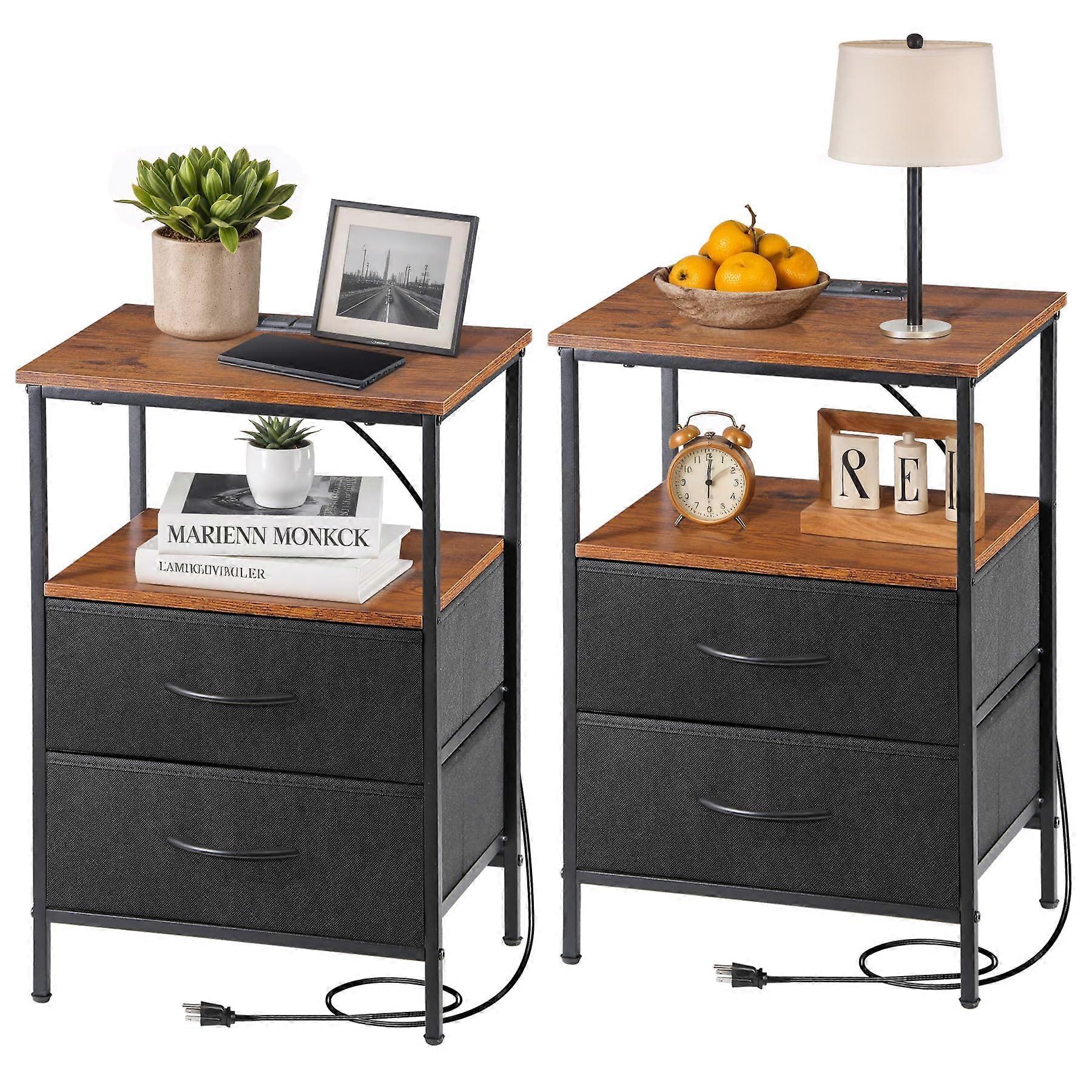 Set of 2 Rustic Nightstands with USB Ports and Outlets, Fabric Drawers, Metal Frame for Bedroom