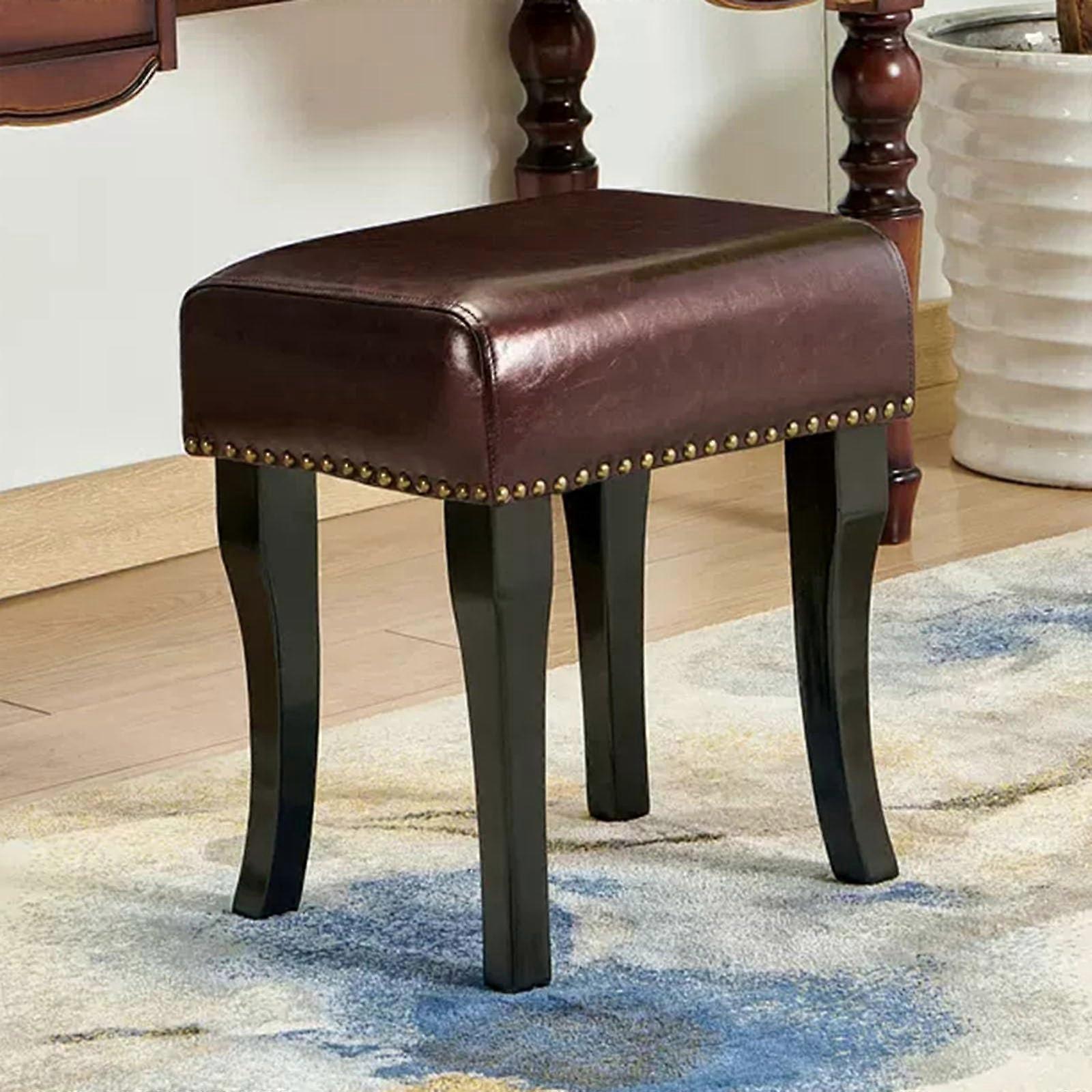 Vanity Stool with Cushion, PU Leather Makeup Chair for Bedroom, Wooden Legs, Brown, 240Lb Capacity