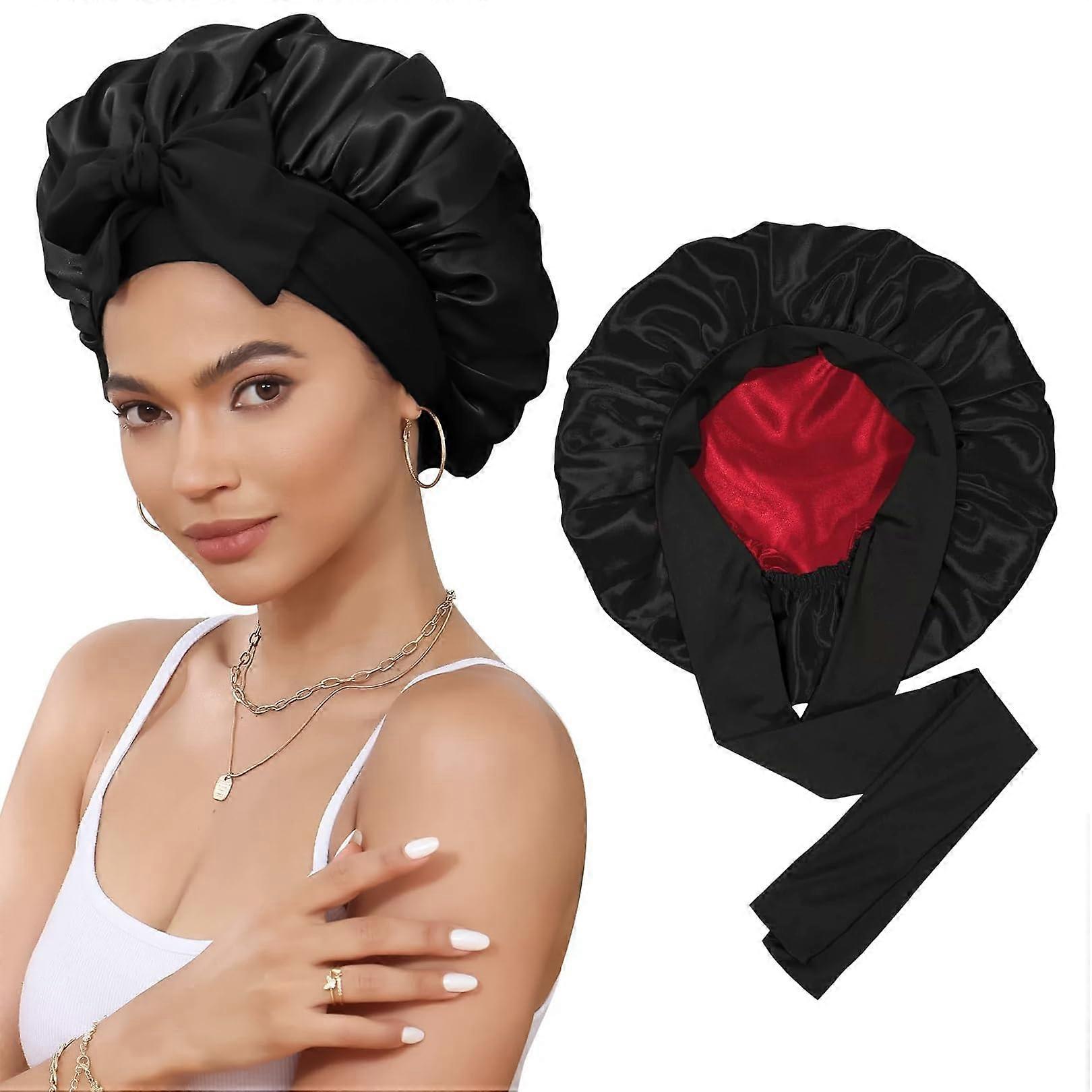 Satin Sleep Bonnet for Women Frizz Reduction Silk Hair Cap Night Sleeping Black Red