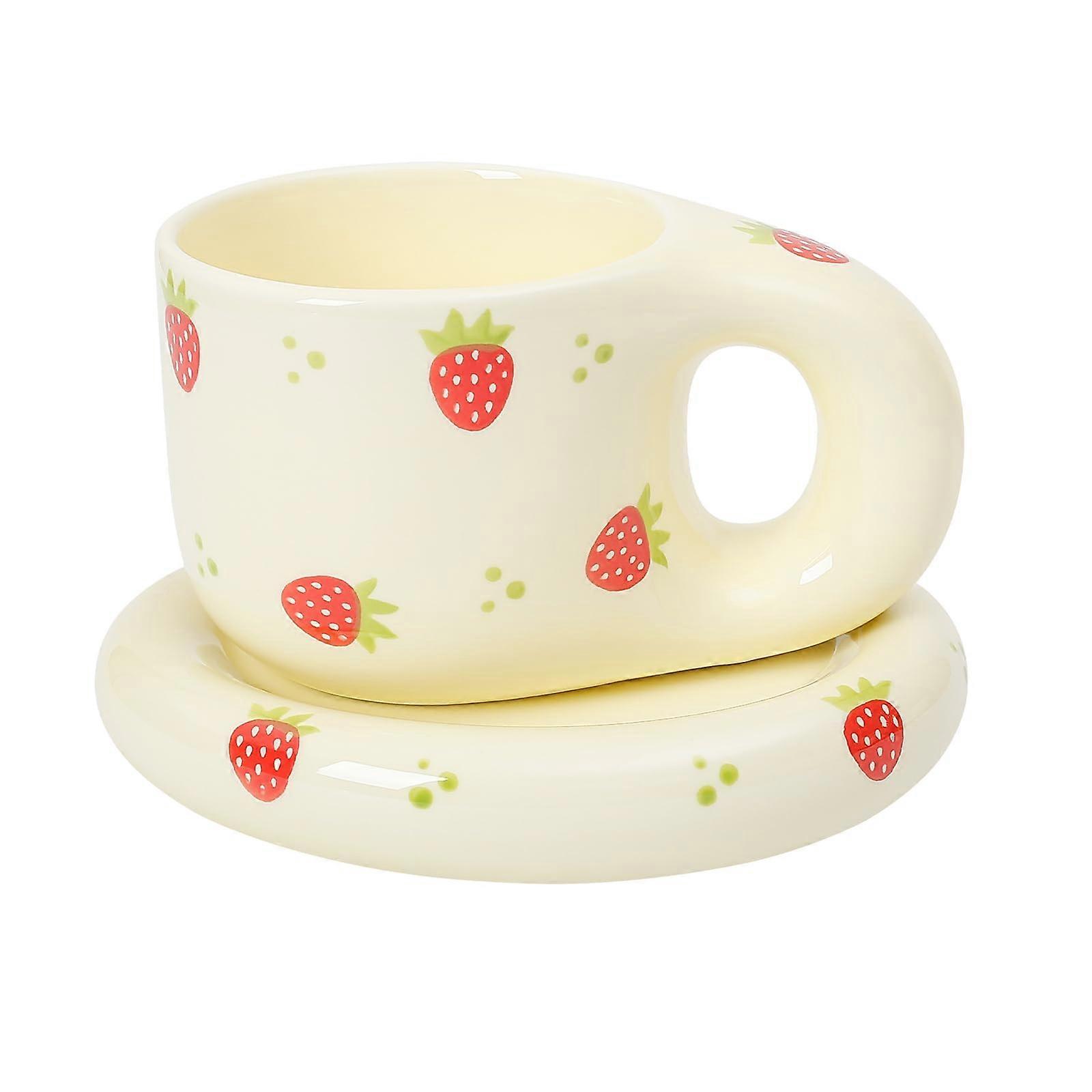 Ceramic Coffee Mug Set with Saucer, 10 oz Cute Strawberry Latte Cup, Large Handle, Dishwasher Safe