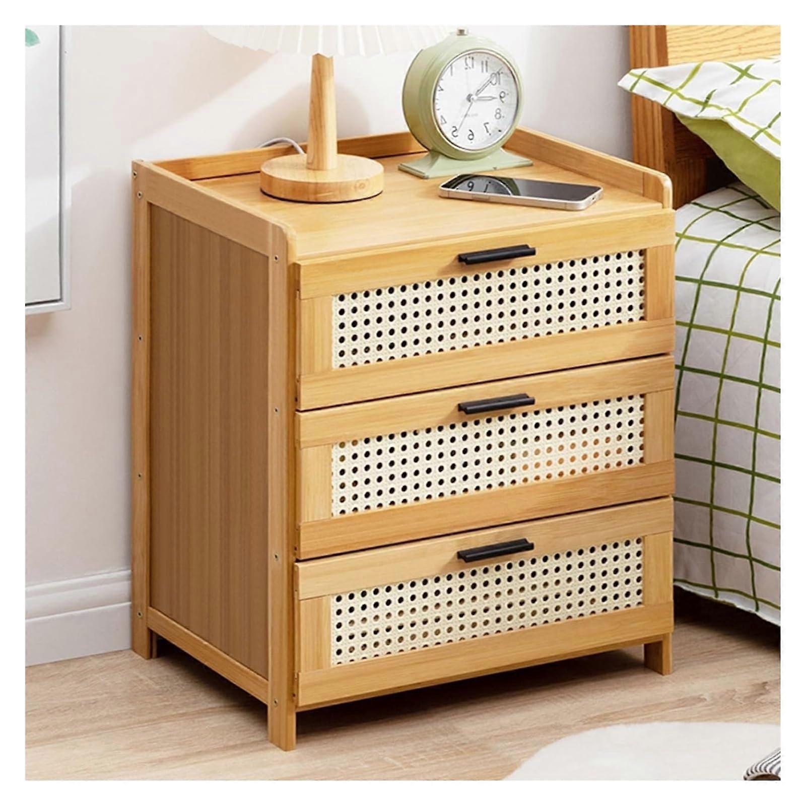 Stylish Imitation Rattan Nightstand Elevate the look of your bedroom or living area with this modern, minimalist nightstand featuring an elegant imitation rattan design. Its versatile aesthetic blends seamlessly with a wide range of furniture styles, adding both warmth and sophistication to your home decor. Functional Storage Solution Designed with three spacious drawers and an open shelf, this nightstand provides ample storage for essentials such as books, electronics, or decorative pieces. Keep your bedside clutter by organizing items neatly within easy reach. Quick and Easy Assembly Engineered for convenience, this nightstand can be assembled quickly with minimal effort. Clear instructions and a practical design ensure you can enjoy your piece of furniture without unnecessary delays. Versatile Home Use While ideal as a bedside table, this rattanstyle piece also works as an end table in the living room, entryway, or study. Use it next to your sofa for storing remote controls and magazines, or place it beside an armchair to hold reading materials and a table lamp. Key Benefits Elegant imitation rattan finish enhances both modern and transitional interiors. Three drawers plus open storage offer flexible organization options. Compact size fits comfortably in bedrooms, apartments, or small spaces. Works as a nightstand, living room end table, or decorative side table. Simple assembly process means you can start using it right away. Practical Applications 1. In the bedroom, store bedside essentials like glasses, chargers, and nighttime reading materials while keeping the surface clear for a lamp or clock. 2. In the living room, use it to hold decorative items on while keeping remotes, coasters, and media accessories neatly stored inside. 3. In a home office or reading nook, organize stationery and books while using the open shelf for display pieces or a plant. This imitation rattan nightstand offers both style and function, making it a reliable and adaptable addition to any home.