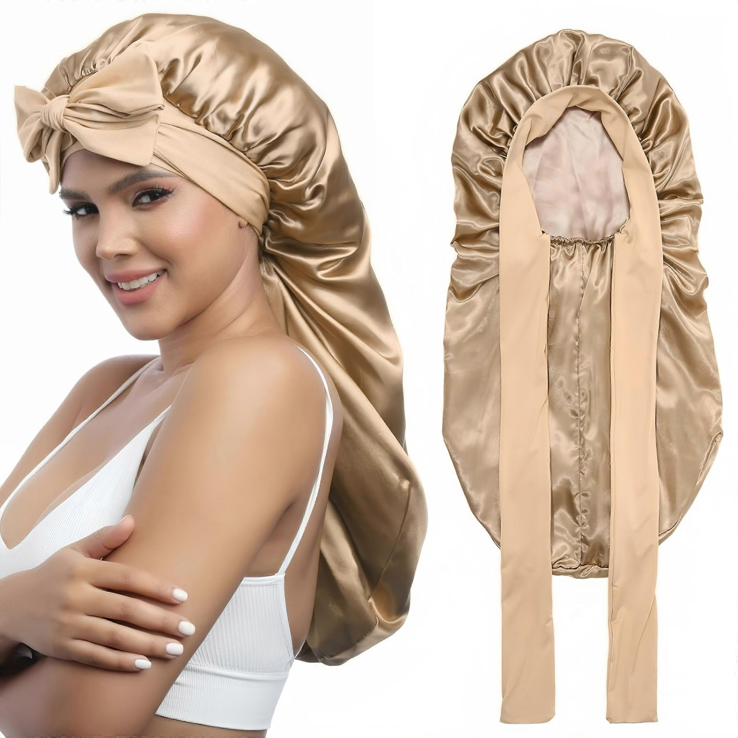 Silk Sleep Cap for Women with Elastic Band, Long Satin Bonnet for Sleeping, Soft Gold Night Cap