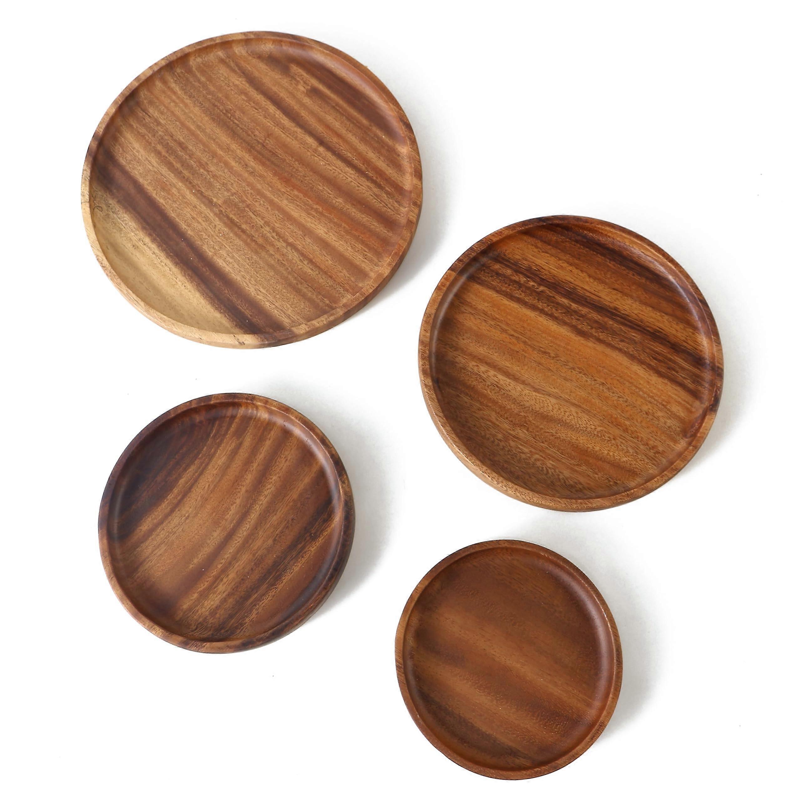 Walnut Wood Dining Table with Round Wooden Tray Set of 4 for Coffee, Breakfast and Home Decor