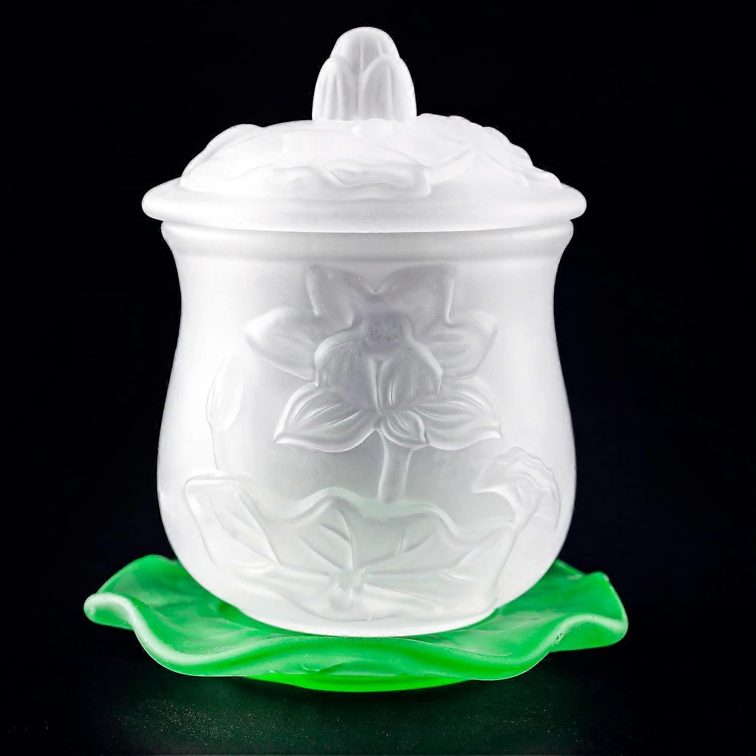 White Glass Buddha Altar Water Offering Cup with Matte Finish and Leaf Plate for Ritual Use