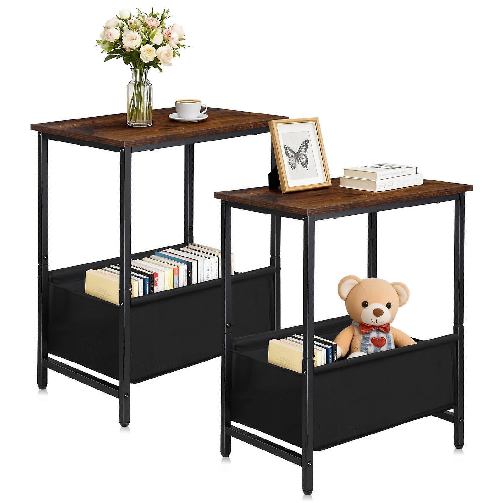 Nightstand Set of 2, Rustic Brown 2 Tier Side Tables with Fabric Storage for Small Spaces