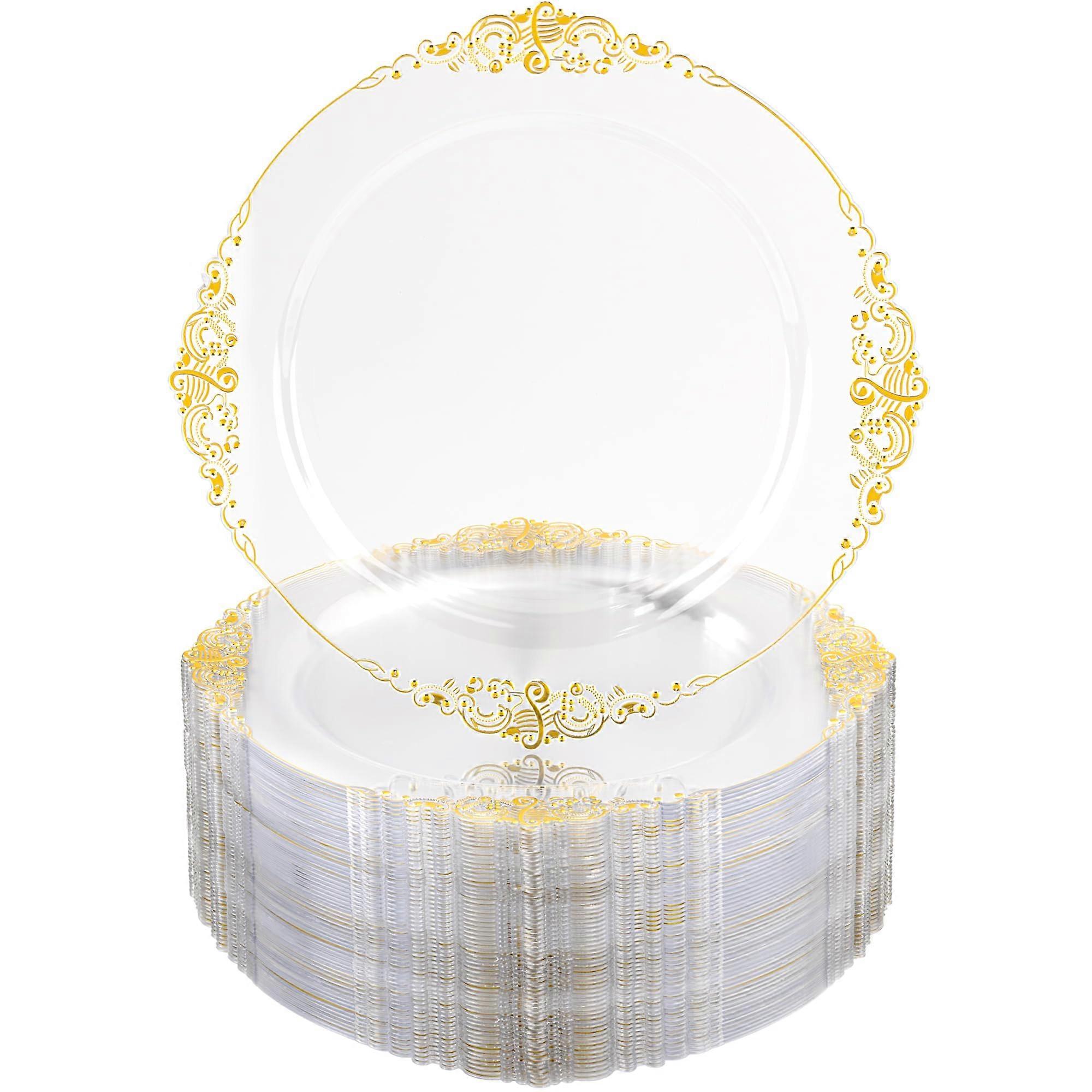 100PCS 10.25 Inch Gold Disposable Plastic Dinner Plates Elegant Heavyweight Clear Gold Party Plates