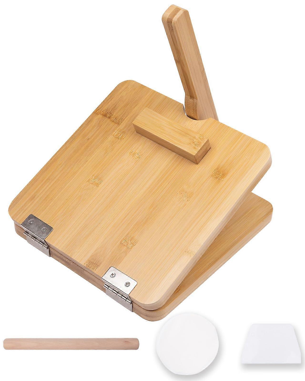 Wooden Tortilla Press 10 Inch Square Set with Rolling Pin Dough Scraper and 50 Papers