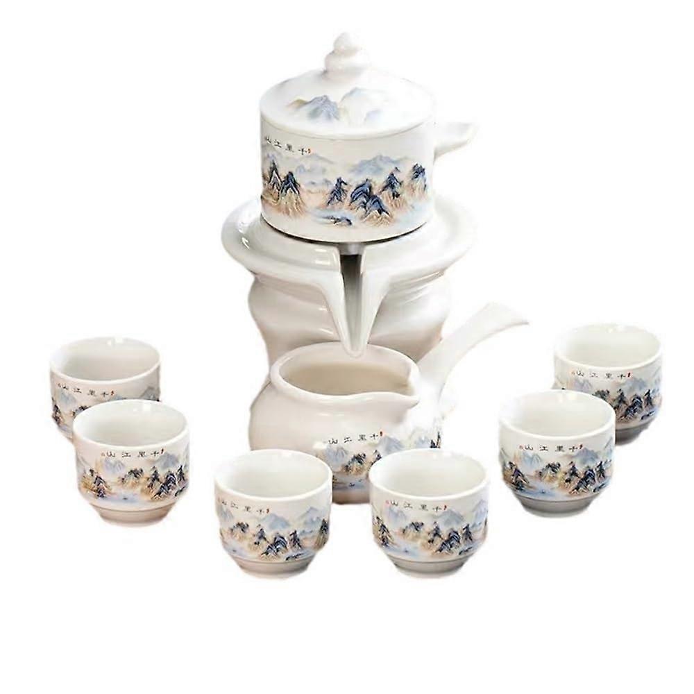 Porcelain Tea Set with Rotating Teapot, Retro Print, AntiScalding Handle for Home or Office