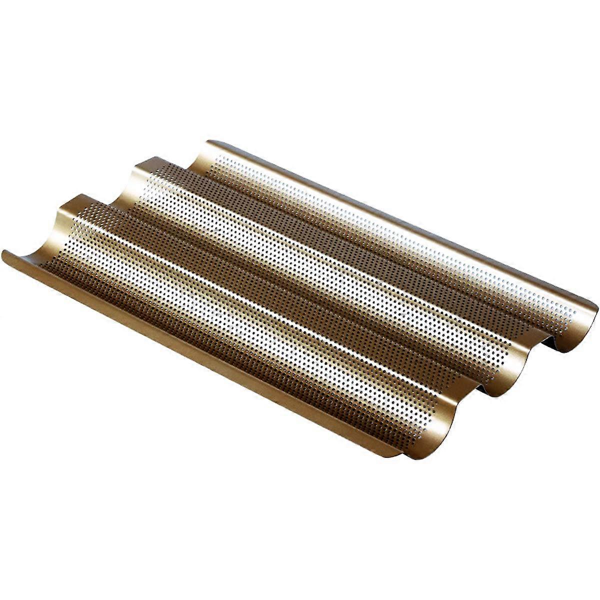 Baguette Baking Pan Nonstick Carbon Steel French Bread Tray 3Well Heat Circulation Gold