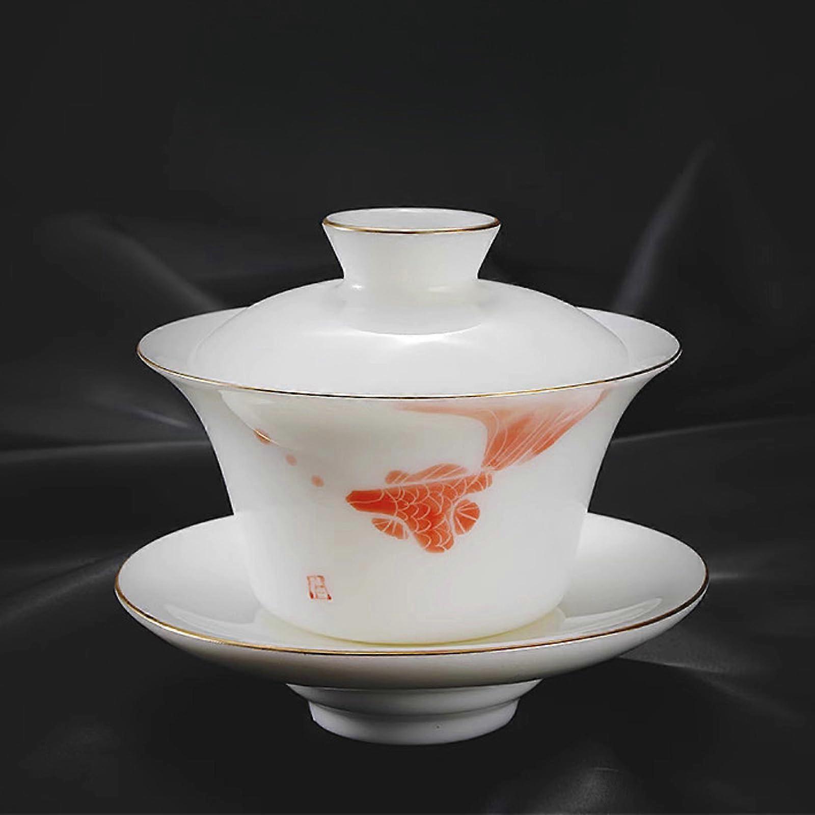 Handmade Jingdezhen Ceramic Gaiwan Tea Set with 130ml White Koi Fish Porcelain Cups