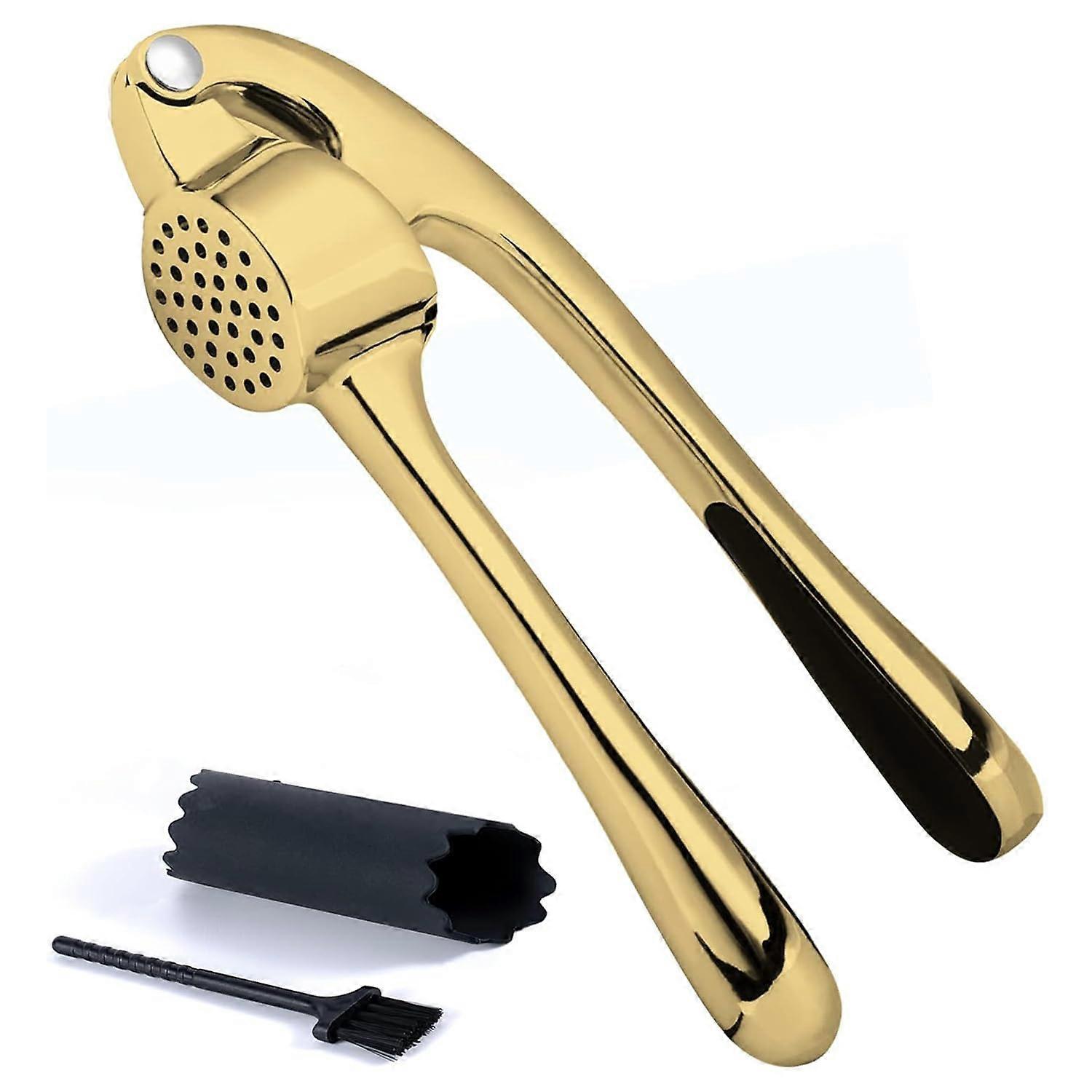 Garlic Press Set Heavy Duty Rust Proof with Silicone Peeler and Brush Dishwasher Safe Gold