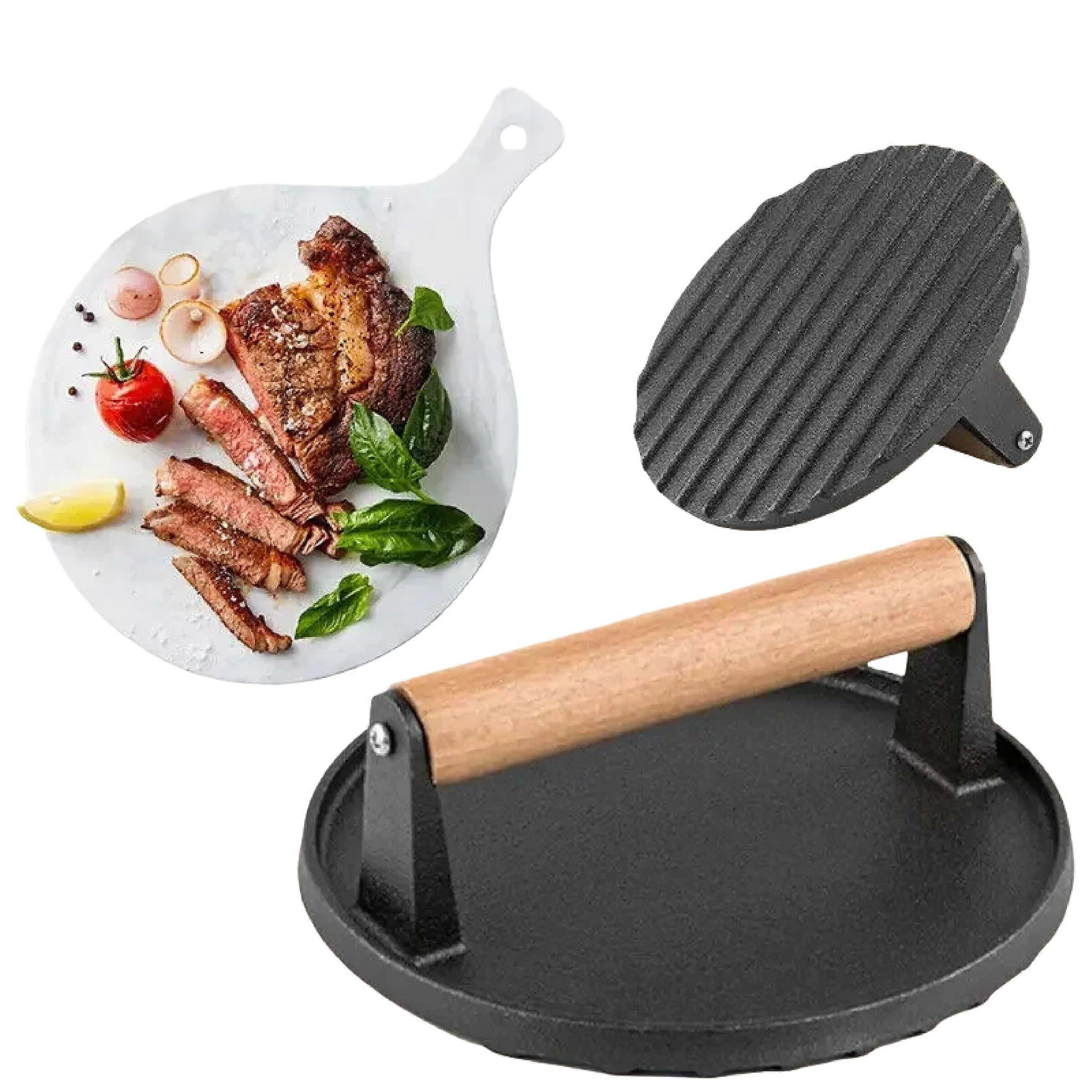 Cast Iron Grill Press for BBQ, 2LB Round Smash Burger Press with CoolTouch Wood Handle, Sear