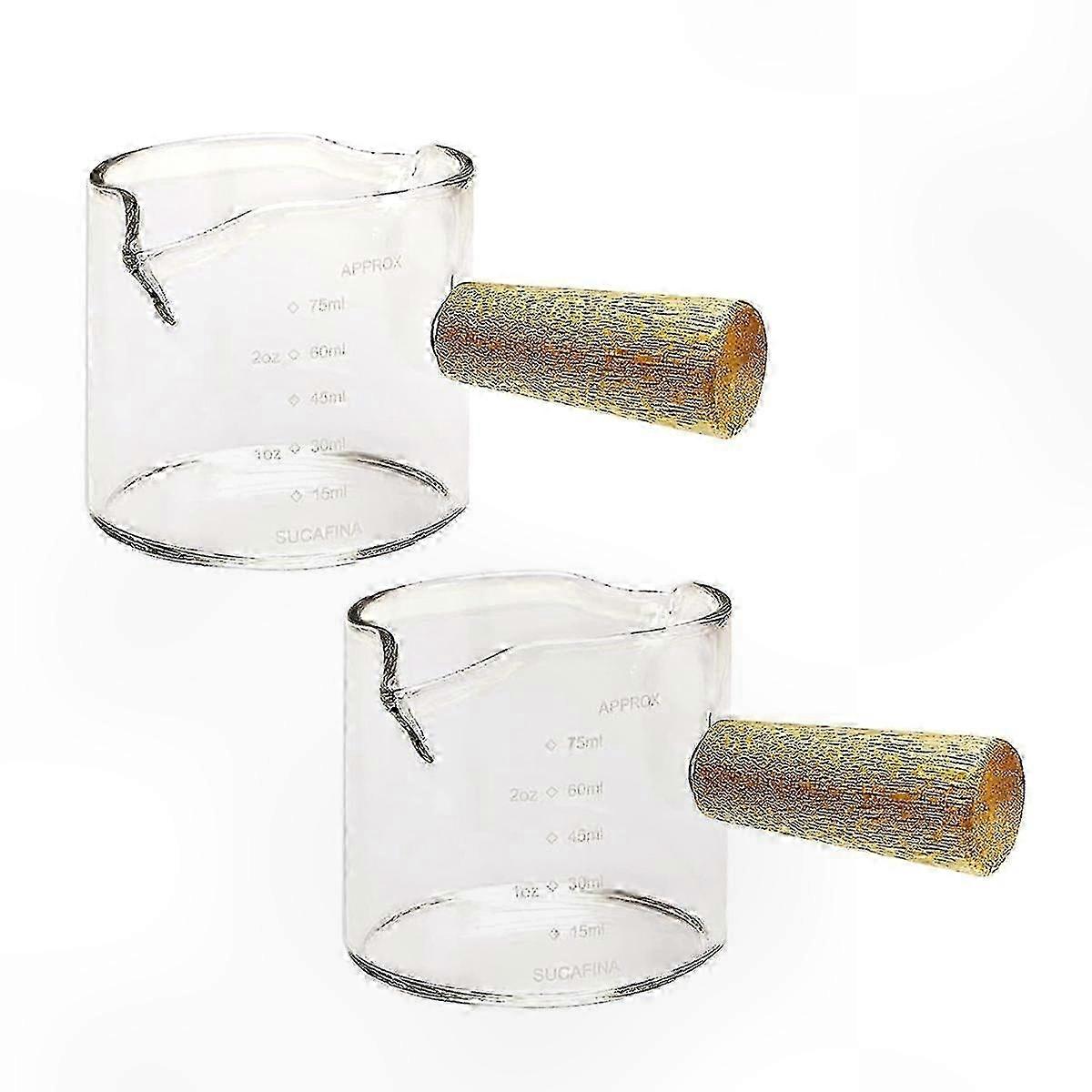 Dual Spout Espresso Shot Glasses with Wooden Handle - 2 Pack Measuring Cups for Coffee Enthusiasts