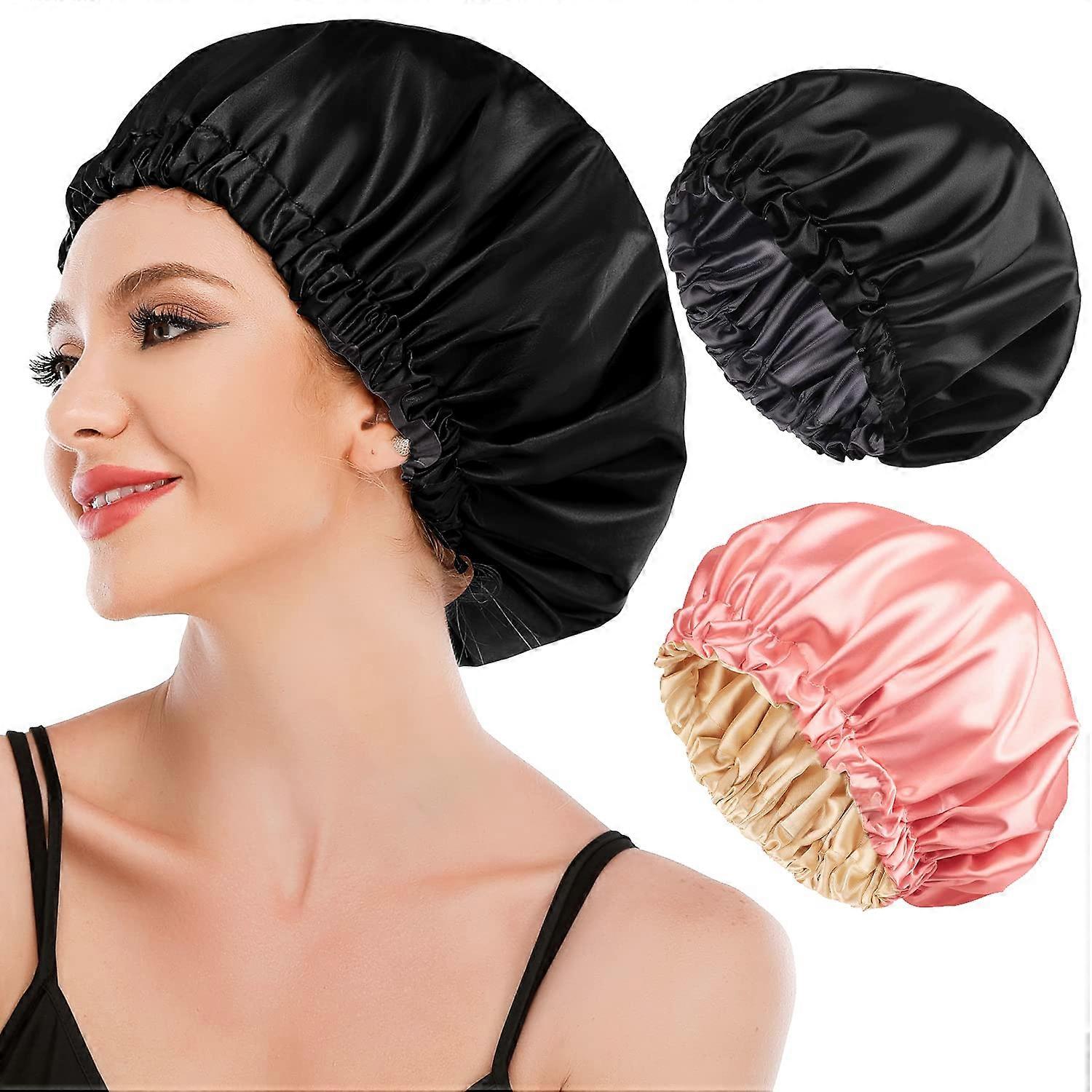 2 Pack Satin Lined Waterproof Shower Cap for Women, Reversible Double Layer Bonnet, Black and Blush