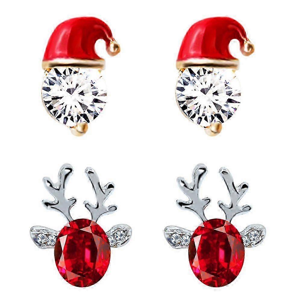 2 Pairs of Festive Christmas Stud Earrings with Christmas Hat and Deer Antler Designs
