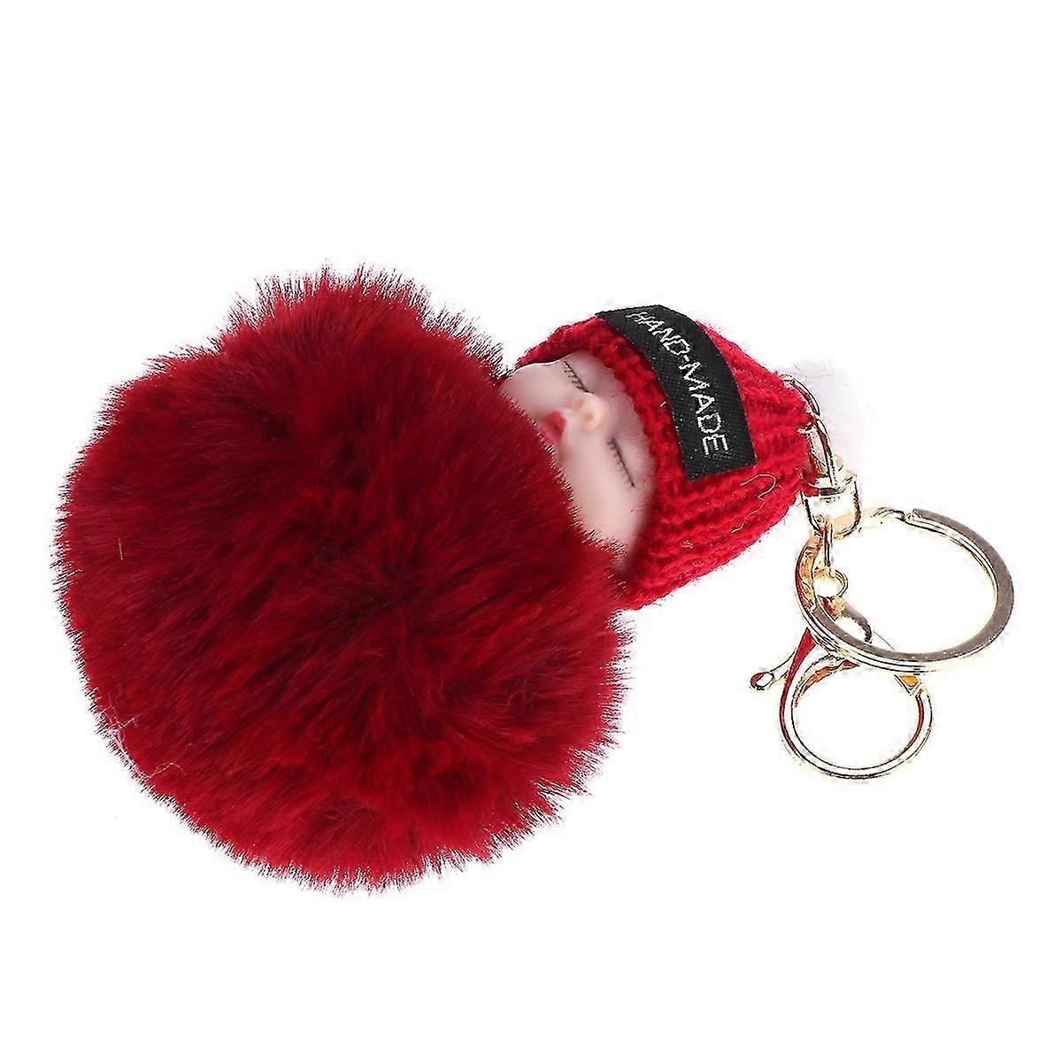 Wine Red Cute Sleeping Baby Doll Pom Pom Fluffy Keychain Hanging Pendant Keyring Gift