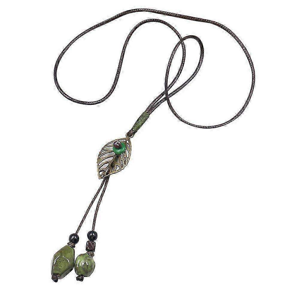 Green Elegant Ceramic Bead Long Sweater Chain Necklace with Leaf Leather Pendants for Women Simple C