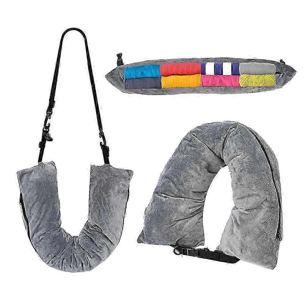 A grey, stuffable Travel Neck Pillow with clothes for extra storage and for traveling.