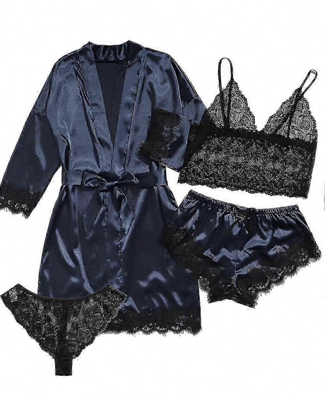Soft fabric Imported Drawstring closure Hand wash or machine wash. Do not bleach. Fabric: Made of satin and lace, skin-friendly, breathable, and soft. Easy to put on and take off for all-day comfort. Features: 4-piece sleepwear set includes lace lingerie set, satin night robe with belt, and sleep shorts. Comfortable pajama set for relaxing days or nights. Adjustable V-neck straps. Occasions: Suitable for daily home wear, pajama parties, girls’ day, bridal showers, and other casual or special occasions. Gift: A thoughtful gift for girlfriend, wife, mother, sister, or friend for birthdays, Christmas, New Year’s Day, Mother’s Day, Thanksgiving, Valentine’s Day, honeymoon, or other celebrations.