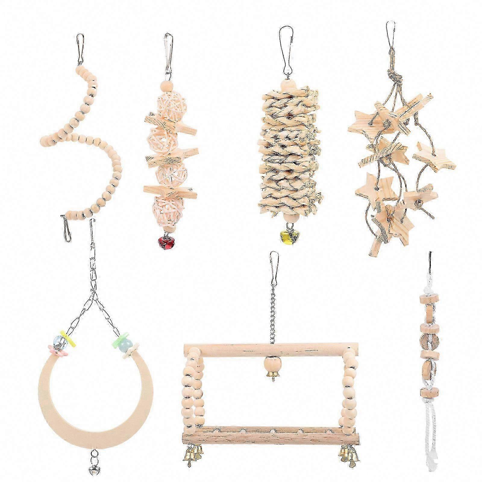 Parrot Chewing & Swing Toy Set - Natural Wood Hanging Bird Cage Accessories - Interactive Enrichment Toys for Parrots, Budgies & Pet Birds - 7 Pack