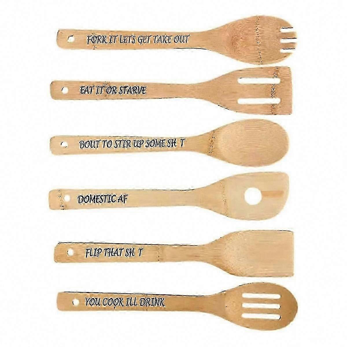 Funny Engraved Wooden Spoon Set - 6-Piece Bamboo Cooking Utensil Collection | Natural Fibre, 6 Sayings | Unique Christmas Gift for Home Cooks