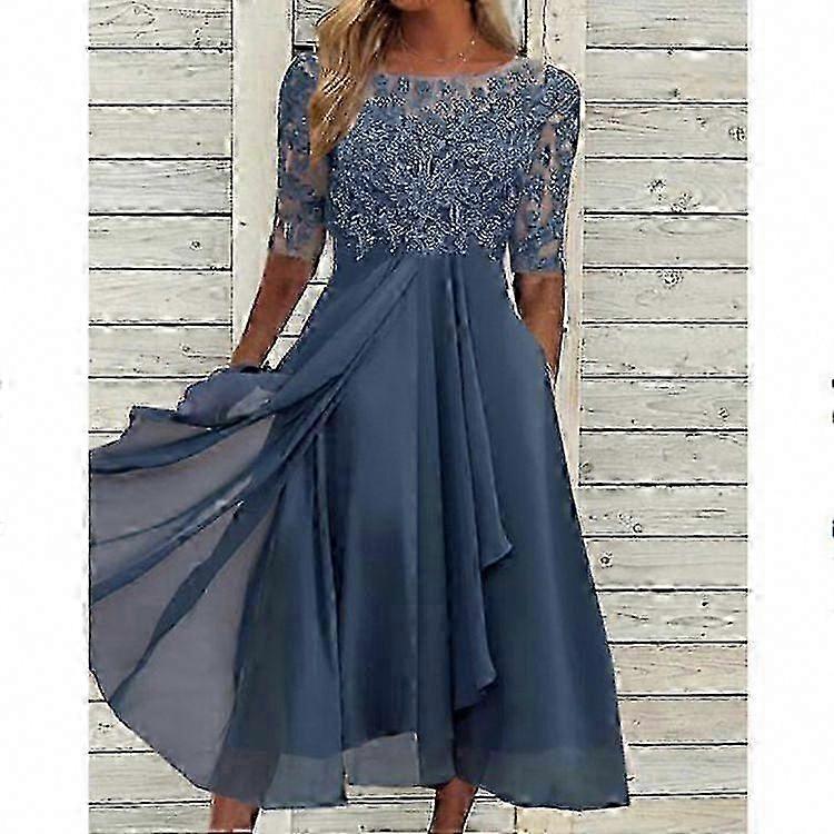 Elegant Lace Appliques Midi Dress - Premium Short Sleeve Evening Gown | Chiffon Fabric, Blue, Versatile Fit - Perfect for Wedding Guest or Party