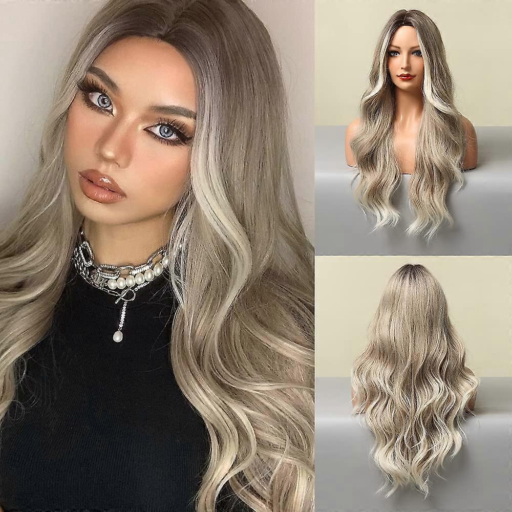 26 Inch Platinum Blonde Wavy Wig Ombre Ash Brown Heat Resistant Synthetic Hair with Natural Look